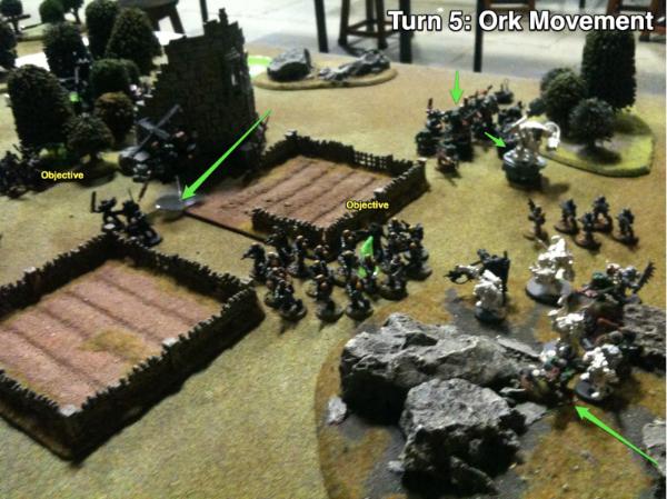 The remaining Orks move to stem the tide of Guardsmen. The Deffkopta flies over to deal with the Platoon Command Squad, the Kommandos continue to bear down on the blob squad, Morgrim detaches and moves towards the other Platoon Command Squad whilst his boyz continue to move up towards the right objective.