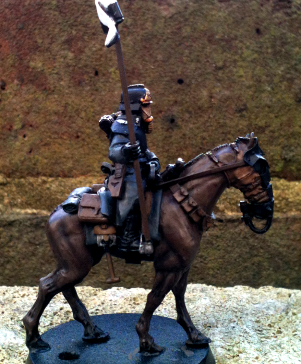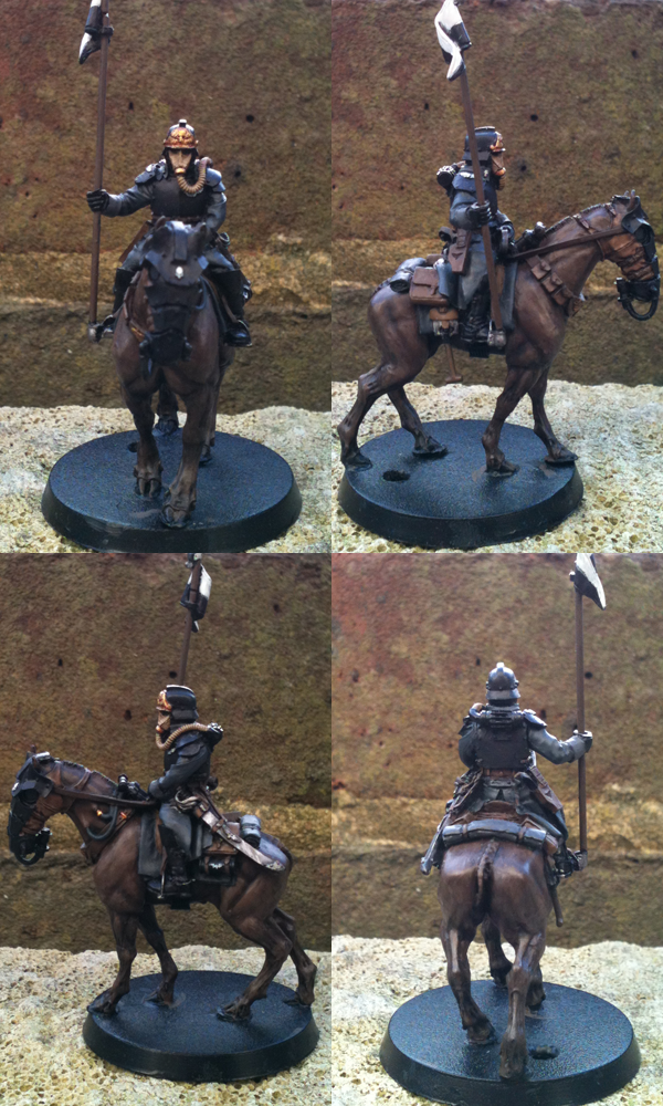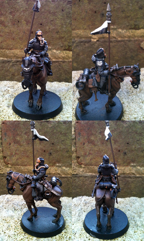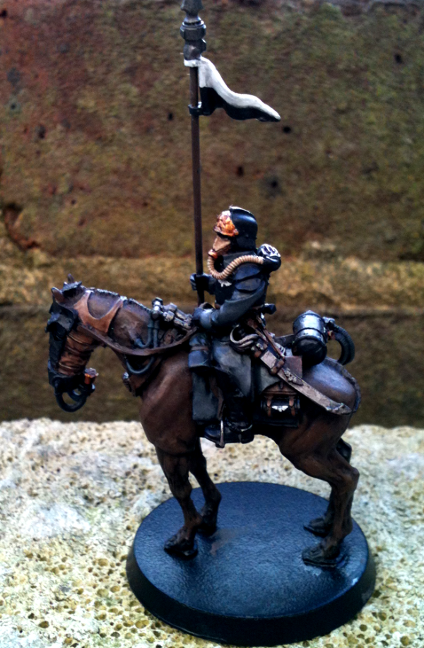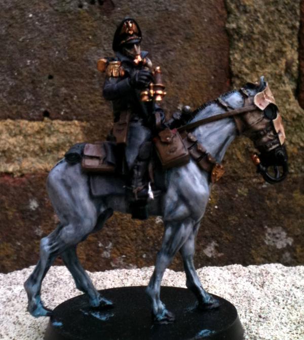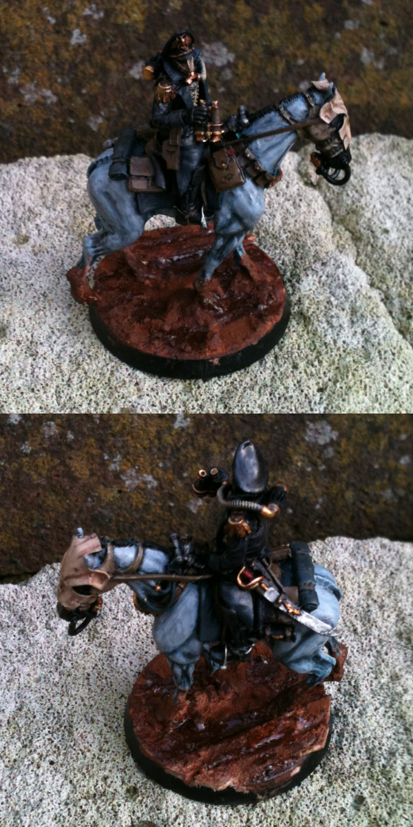 When I moved on to the Inquisitor I wanted to retain the dark tone of the army, for him to be united with his unit whilst adhering to true Commissar form. So his trenchcoat recieved the customary Commissars black treatment, highlighted with mixtures of Black & Citadel Liche Purple. For the lightest highlights I added in a bit of Iraqi Sand. The braid across his chest is painted from Biege Brown up to Iraqi Sand to tie his uniform in with the horses armour, whilst brass buttons tie in with the rest of the models brass/gold metalwork. Epaulets, binoculars, gasmask filter, metallic parts of the mask etc are all in gold/brass to keep it consistant with the general feel of the model & army*. The gasmask itself started off as Leather Brown worked up to Iraqi Sand & then washed with Devlan Mud. Cuffs & lapels/collar are painted in the same grey, Vallejo Black Grey, as the units cuffs & collars to unify him with them. Spurs & stirrups are finished in mithril silver whilst the sword has a brass hilt & the scabbard is a mixture of boltgun metal with mithril highlights given a lovely coat of Badab Black.
