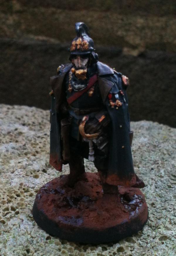 Finally decided on my colour scheme for my infantry. Deep, dark grey uniforms with dark brown cuffs & colours. Tried it out on my Company Commander & it looks rather nice.