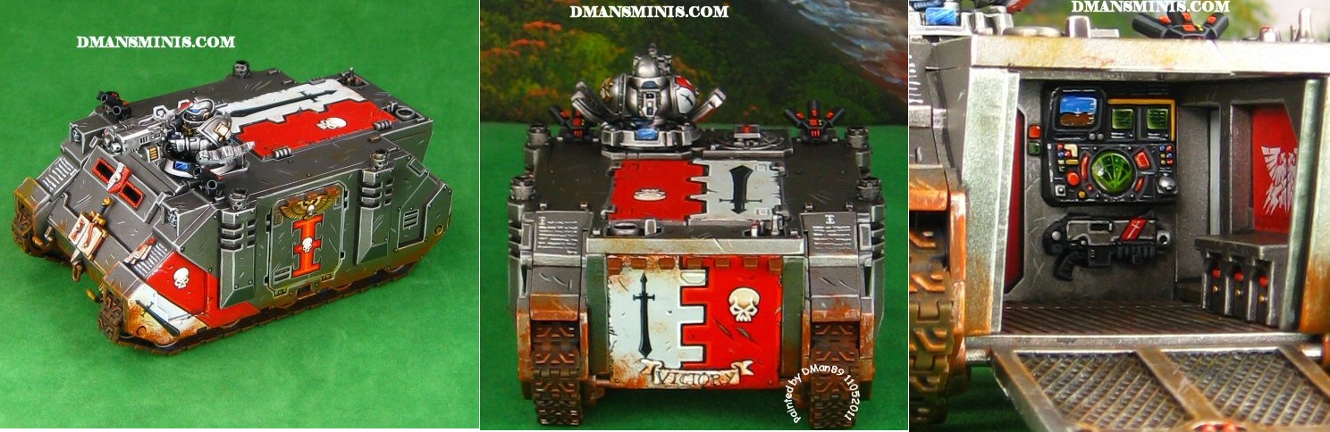 The model was primed all black. A platinum metallic spray was used as base coat. Highlighted with silver. Blood Red and a white/Astronomicon Grey mix was used for the Grey Knights heraldry. The top hatch is removeable and the rear interior is fully painted.