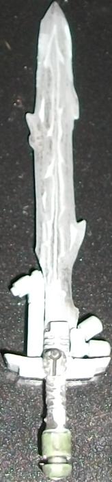 The Claw of Terris, a (now former) Daemon Weapon that was weilded by a lesser Daemon Prince in an assault on the world of Kardas-which is on the edge of the Nal'da Sept's southern border. They did not anticipate the Tau to have the psychic-sensitive marines on their side, so the Daemon Prince foolishly left himself 'exposed' in a sense, allowing the Shadow Dragons' Librarians to track his course. The invasion was a massive failure for the rather unorganized warband, the Tau of Nal'da-and the Shadow Dragons-lying in wait for them, encircling their fleet in orbit and destroying nearly every ground asset. In the fight, though, Orpheus' battlesuit took a meltabomb to the shield arm; the shield itself (and the fact that the suit is based on the rugged XV9 chassis) kept the suit from being outright destroyed-though the entirety of the left arm, shield, left VRT, the shoulder-mounted plasma rifle, and a few of the sensors on the head were lost. Armed with his gifted spear, he impaled the Chosen that planted the charge and tossed him to the Kroot, eventually entering battle with the Daemon Prince Zur'dal himself. He inflicted wounds on the beastial being, but a hard blow from Zur'dal's daemon weapon shattered even the shielded and runed adamantium haft of the spear, the Frost Blade that ended it cracked beyond repair. Careful Maneuvering-and personal intervention from the Chapter Master of the Shadow Dragons, Bahamut-finally won the day, though, the Daemon Prince banished and the remainder of his squabbling warband fleeing. As Orpheus' battlesuit was being repaired and overhauled, the Librarians of the Shadow Dragons put their skills-and their newest members-to the test, Consecrating the blade that Bahamut managed to wrestle from Zur'dal's grasp. It was gifted to Orpheus for his bravery in the fight-and to replace his beloved spear, which had become an icon to Nal'da and even to the Shadow Dragons. Technology gleaned from the Librarian's Psychic Hoods was implemented in the new hilt and casing at the base of the blade, working in conjunction with the new pods on Orpheus' XV9 to filter out any remaining Warp energy that could allow what may remain of the formerly-bound daemon to influence the commander. When not at war, the blade is kept in confinement, and is directly handled only by drones and the most trusted and powerful of the Shadow Dragon's librarians.