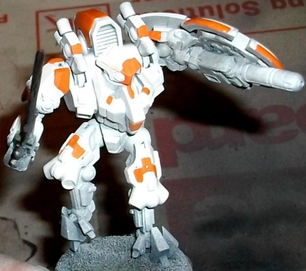 If I go with the white scheme, should I tone down the amount of orange? And should the "mechanical" parts like the legs, backs of the thighs, joints, etc. be boltgun metal or grey? Tempted to go boltgun adn give it black adn yellow markings, akin to the Cerberus color scheme from the Mass Effect games.