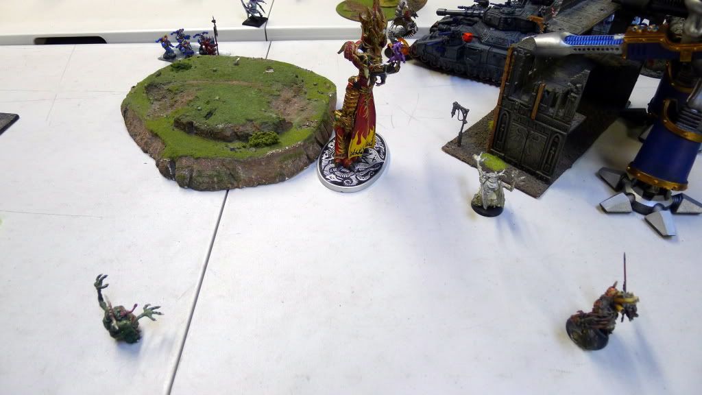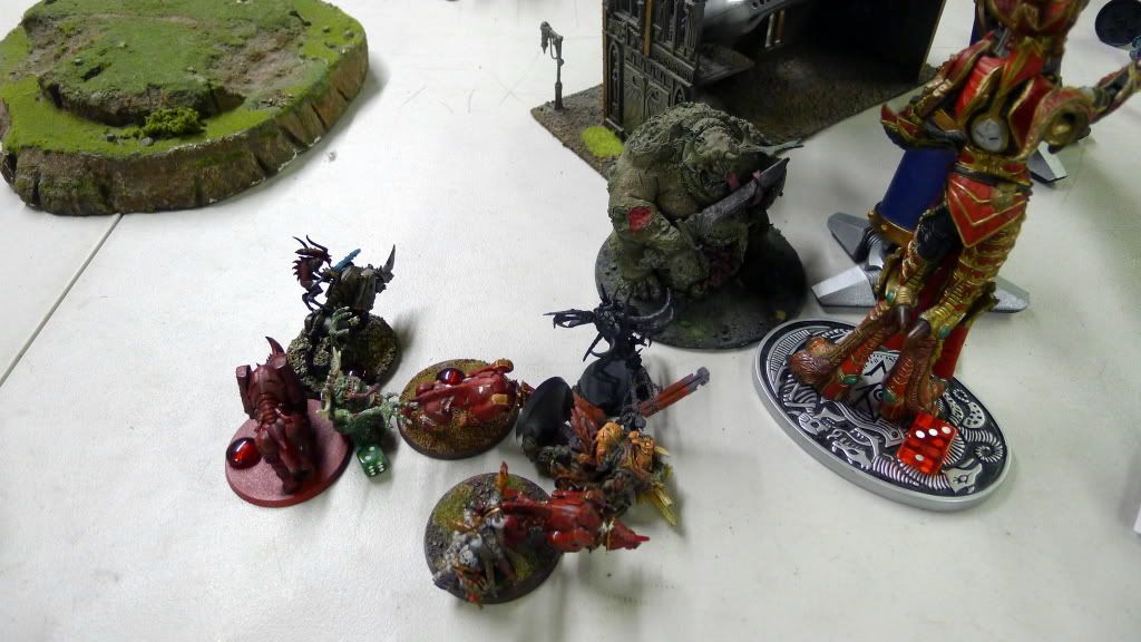My Slaanesh DP lashes Rathius' unit close together and out of area terrain. My oblits then start dropping plasma-bombs on them, killing half the unit.