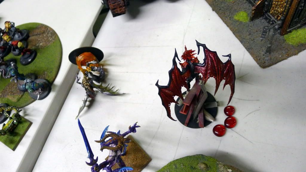 Chris' Chaos Sorcerors split off from Rathius' unit to go after my KoS. Rathius goes after the wounded Bloodthirster.