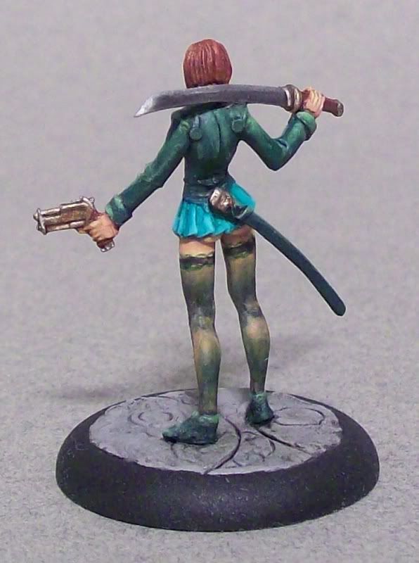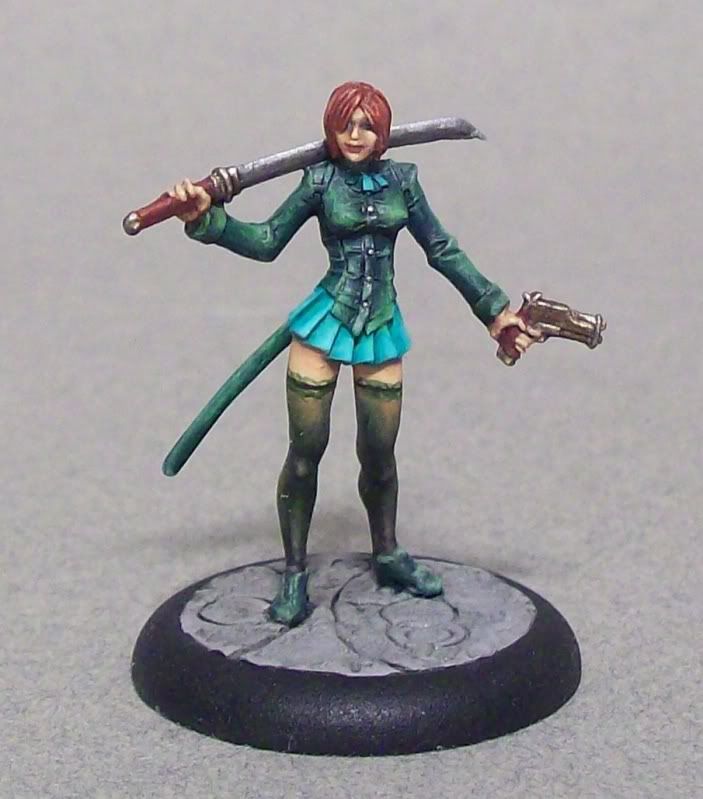 Anima Tactics Wissenschaft agent. She has a very cool kill bill/suckerpunch look. I chose green attire to match the few other models I have painted from her faction.
