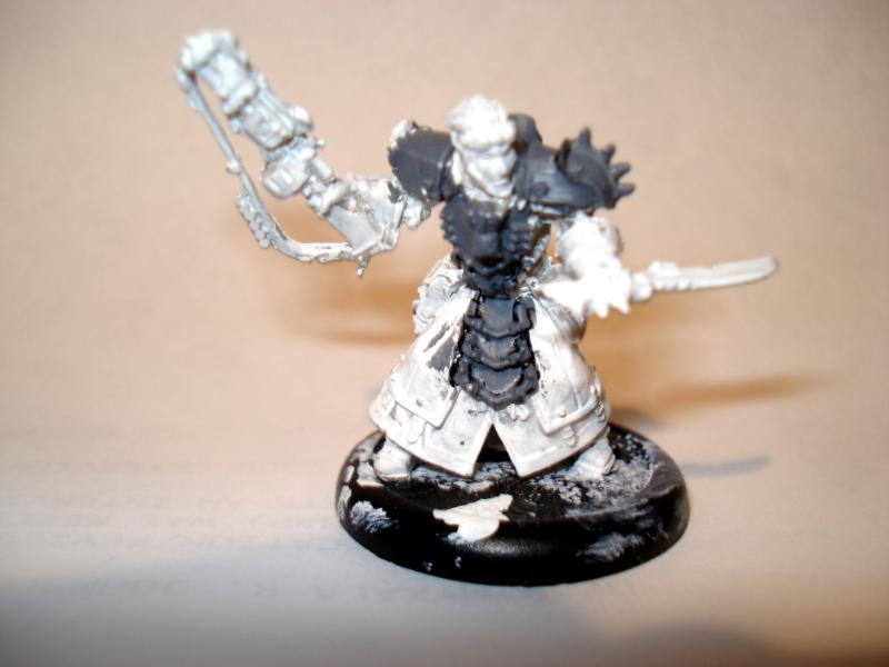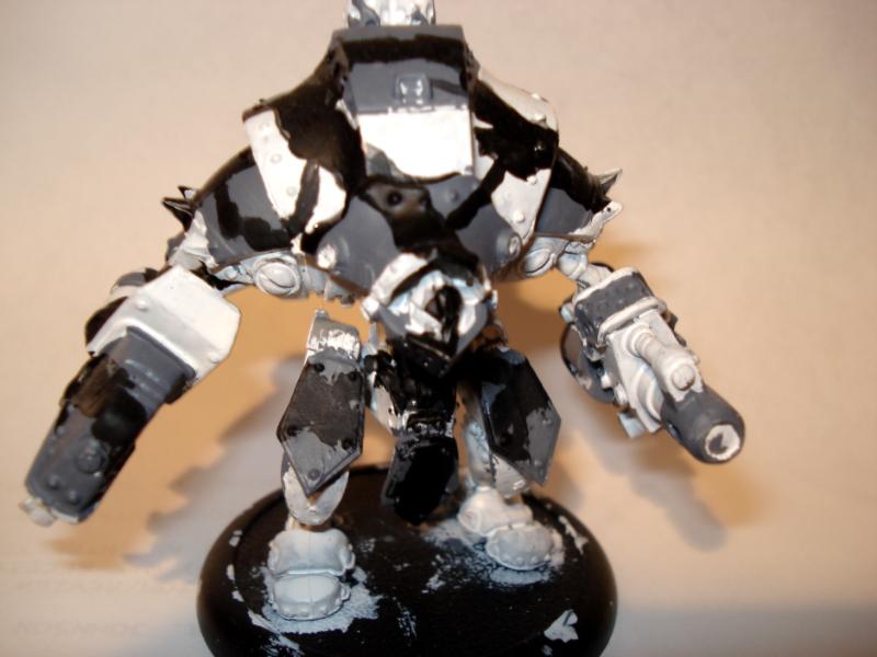 The winter camouflage look can be a good paint scheme, but you'll want to tighten it up a fair bit. Instead of very large, long color stripes like on your warjack, consider condensing the pattern across its large, flat areas. Winter Camo on vehicles tends to be a few bits and pieces of the greys, browns, and blacks on large expanses of white. On soldiers such as Strakhov there, it is more densely patterned.