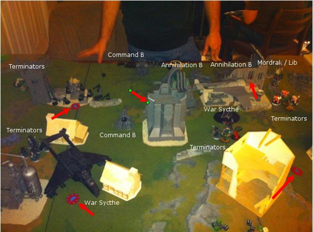 Overload moves past his wrecked Command Barge toward Mordrak’s unit. The remaining Scythe moves away from the left middle section of the table toward an objective and deploys its 5-man squad of Immortals and Cryptic. Monolith moves toward the 5-man Terminator squad that shot at it, hoping to get the range to suck them into the warp. Remaining Command Barge sweep attacks over the 5-man Terminators in front of the Monolith, 1 hit 0 wounds caused. Annihilation Barge moves to get better shooting angles. Capt casts Veil of Darkness to suck up and re-deploy the group of Immortals from his right side of the table to deploy on the left in the building that Mordrak’s unit had shot up in the top of the first round. They scatter into Mordrak’s unit, but Capt rolls a 6 on the mishap and they go back into reserve. Monolith’s gate hits 2 terminators, 1 successful 1 failed STR test, loss 1 of the 5 Terminators. Gauss weapons kill 1 more, down to 3 terminators. The Immortals that disembarked from the Scythe unload rapid fire on the 3 remaining terminators, killing 1 more. (Daemon Hammer and 1 Halberd/Psycannon remain). Annihilation Barge that did not move unloads all weapons at Mordrak’s unit, killing 2 Ghost Knights. Second Annihilation Barge shoots at them as well, killing off the last Ghost Knight. Scythe shoots at Mordrak and the Librarian, cause no wounds to the unit, but the tesla arch’s to the Overlord within 6’’ and causes a wound. Assault phase, Overlord charges Mordrak and the Librarian, successful Psych check for both Hammer Hand and Might of Titan, upping the Lib str to 6 and Mordrak to a 10 hammer. Librarian kills the Overlord, but Ever living roll by the Pirate Capt was successful and the Overlord stands back up after a 5’’ consolidation from Mordrak and Librarian.
