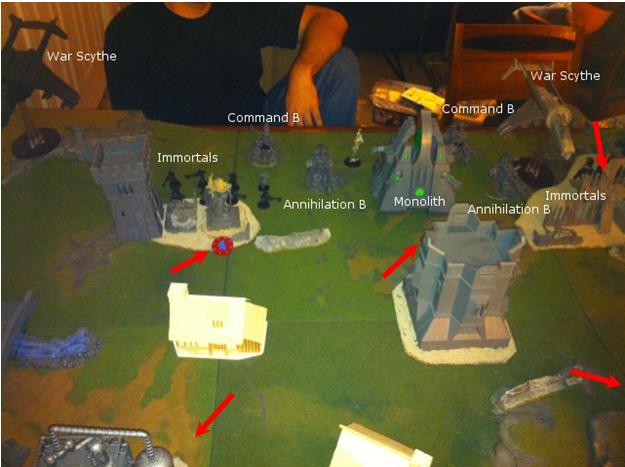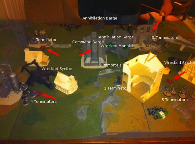 Mordrak, 4 Ghost Knights and Librarian Deep Strike to Capt’s left corner table edge on the opposite side of a building ruin that a full 10 man Immortal squad was camped in over an objective. Librarian successful psych check and shoots 5 Immortals with Warp Rift, all 5 fail leadership and are removed. Mordrak and the Ghosts shoot their storm bolters and kill 2 Immortals and the Cryptec. Nothing else from Grey Knights can be deployed on first turn and that ended my movement, shooting and assault phase very quickly. The 4 remaining Immortals failed their Leadership check and ran 9 inches, putting 1 model off the table and they all disappeared. (Not a bad start for 6 terminators on the table)