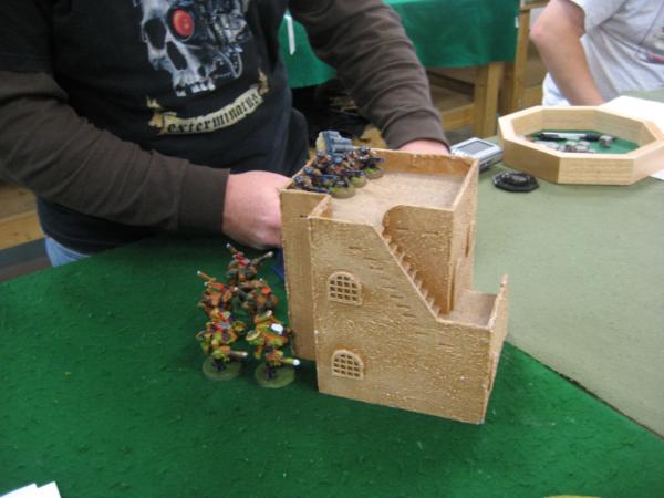 I win deployment by virtue of having more pocket change than my opponent. Kronk places his Immortals around the objective. I briefly discuss the possibility of putting my army so close to his table edge but I decide to KISS and deploy at the far edge like a normal person. I scout up my kopta onto the building on the left and make my dangerous terrain roll.