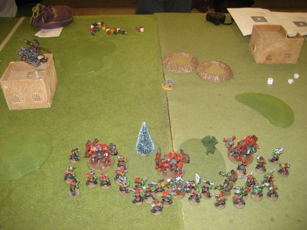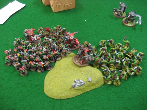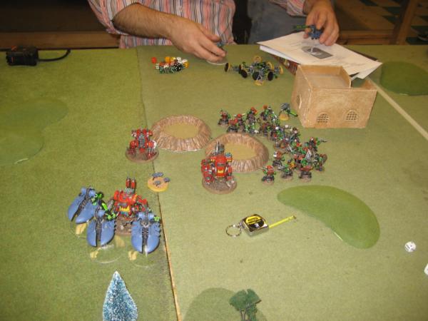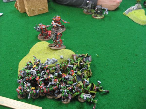 Top of 1, he runs the grots and boys and the kans shoot off the grotzooka and I think stuns it. He seems strangely unconcerned with 2-3 S10 power weapon attacks from the kan’s