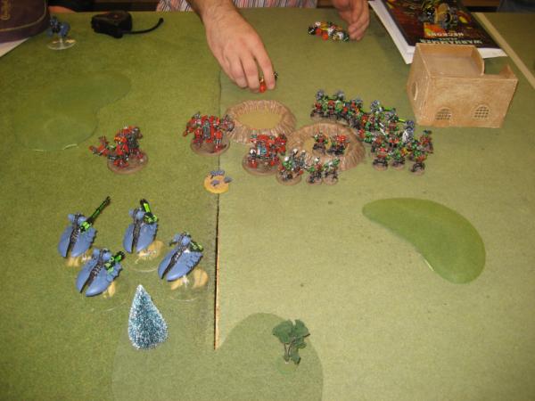 I deploy crammed into the left side. I still planned on marching pretty much straight forward, but I wanted to keep distance because I had shoota boys and he had sluggas, so I wanted to get a bit of shooting in before he could close the gap. With three rokkit kans getting the first turn move, I decide to outflank the kopta, but looking at the table now I probably could have scouted him behind the building and gotten an attack off.