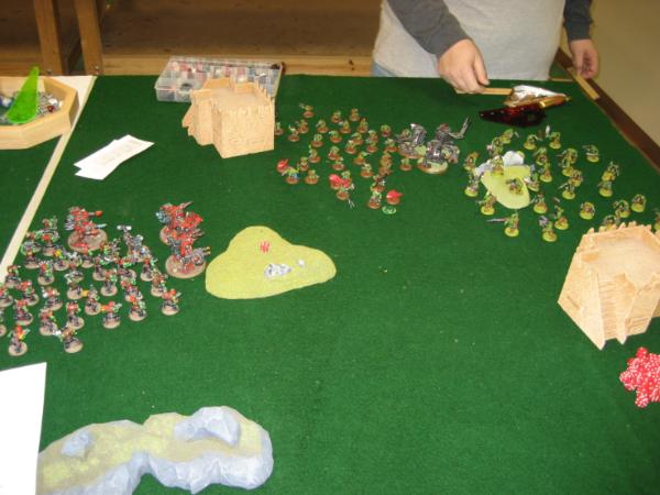 Game 1 is Pitched Battle with Victory Points for having units in the enemy’s deployment zone. In this scenario the youngest player goes first, and at 28 I win! All skill, baby. Incidentally I may be one of the youngest players at the tournament… plenty of old timers. I saw a few young kids wandering around asking questions, though. One kid was maybe 12 and had a