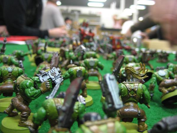 In the long lull before Game 5 started I read the rules and the player with the most models in his list gets to deploy and go first. I have 35 models, so I figure I am golden for that important first turn. Then I get paired up with Jason Herald, the self proclaimed “Herald of Nurgle,” and his Ork army with no less than 66 models (69 if you count the decorative squighounds)!