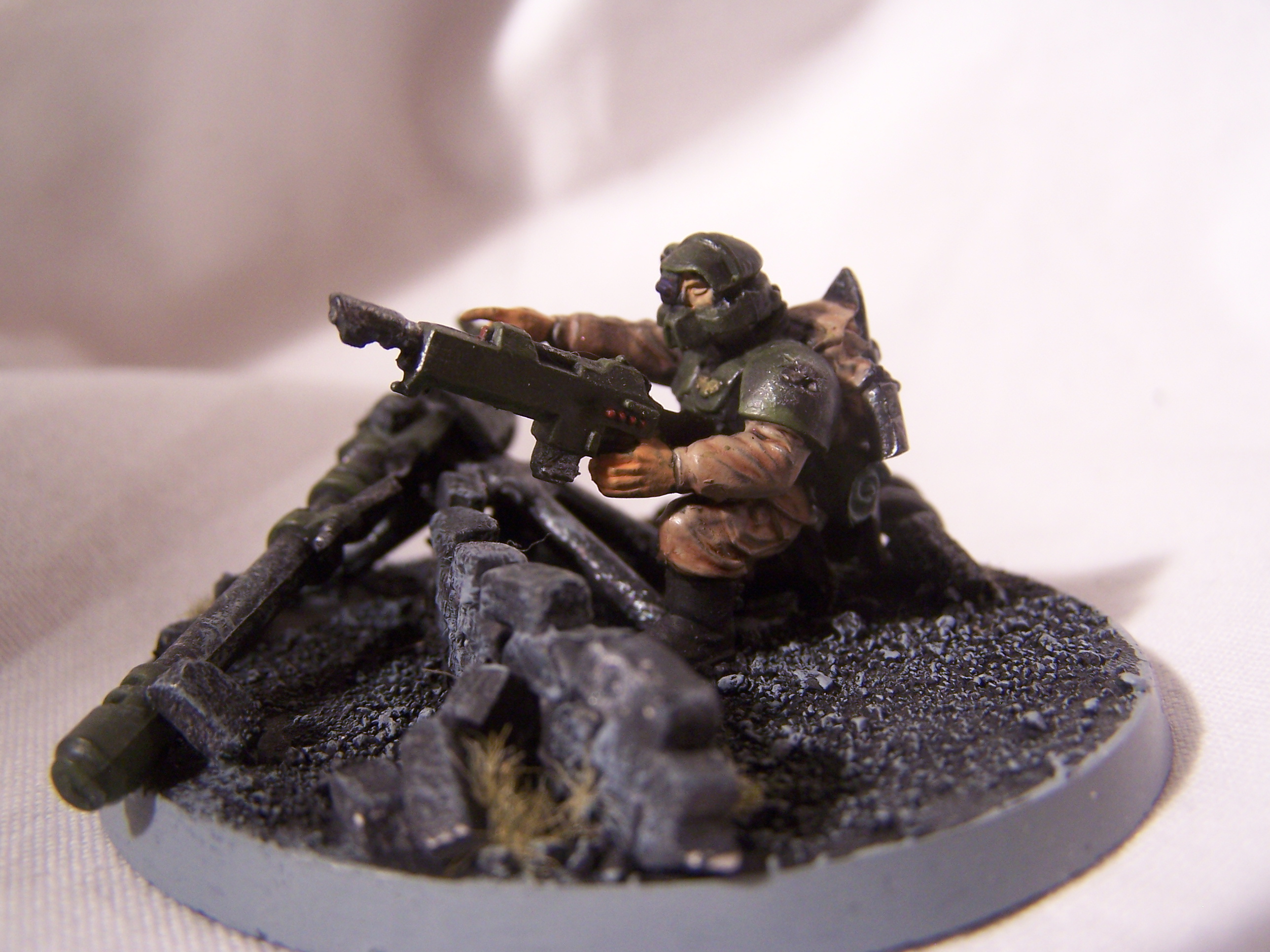 I built this one for him. We hate standard heavy weapons teams that are the two guys looking into the distance with just a bush. We went for the bombed out look for this one.