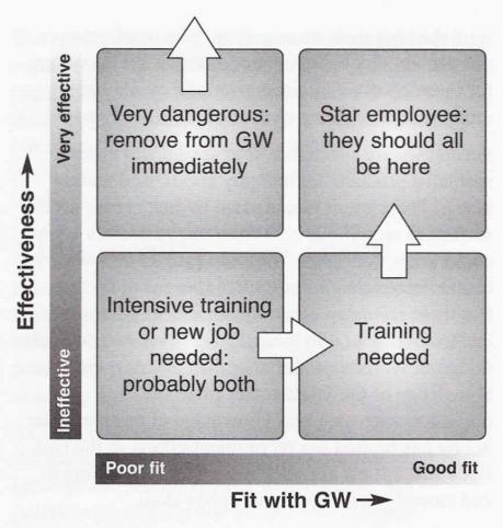 Because it shows that they're more worried about employees fitting with GW than they are about the success of the product. If they are in the bottom-left, the worst possible square, they can move via training. If they are competent at the job but don't fit with GW, they are fired. It should be the other way around.