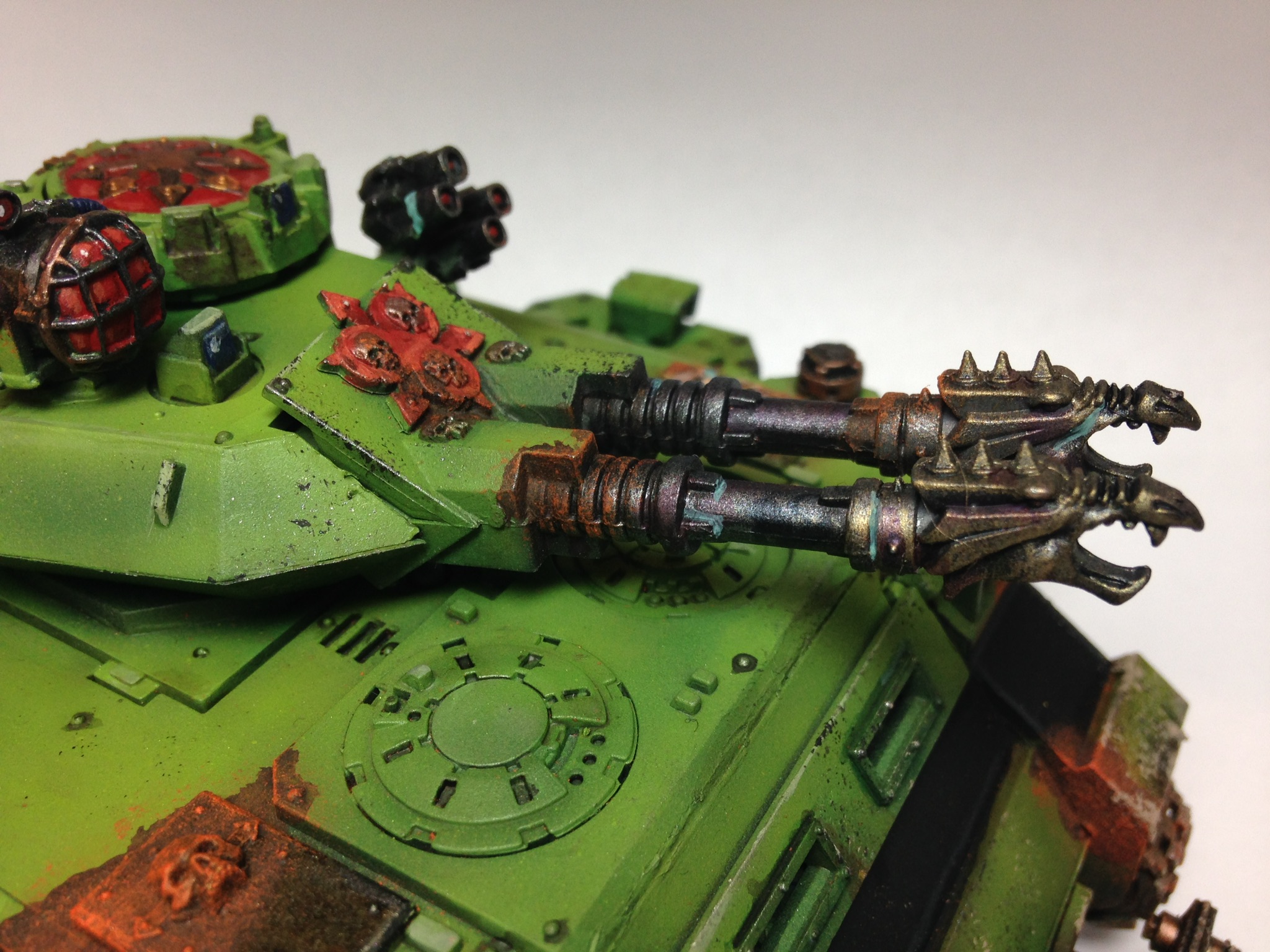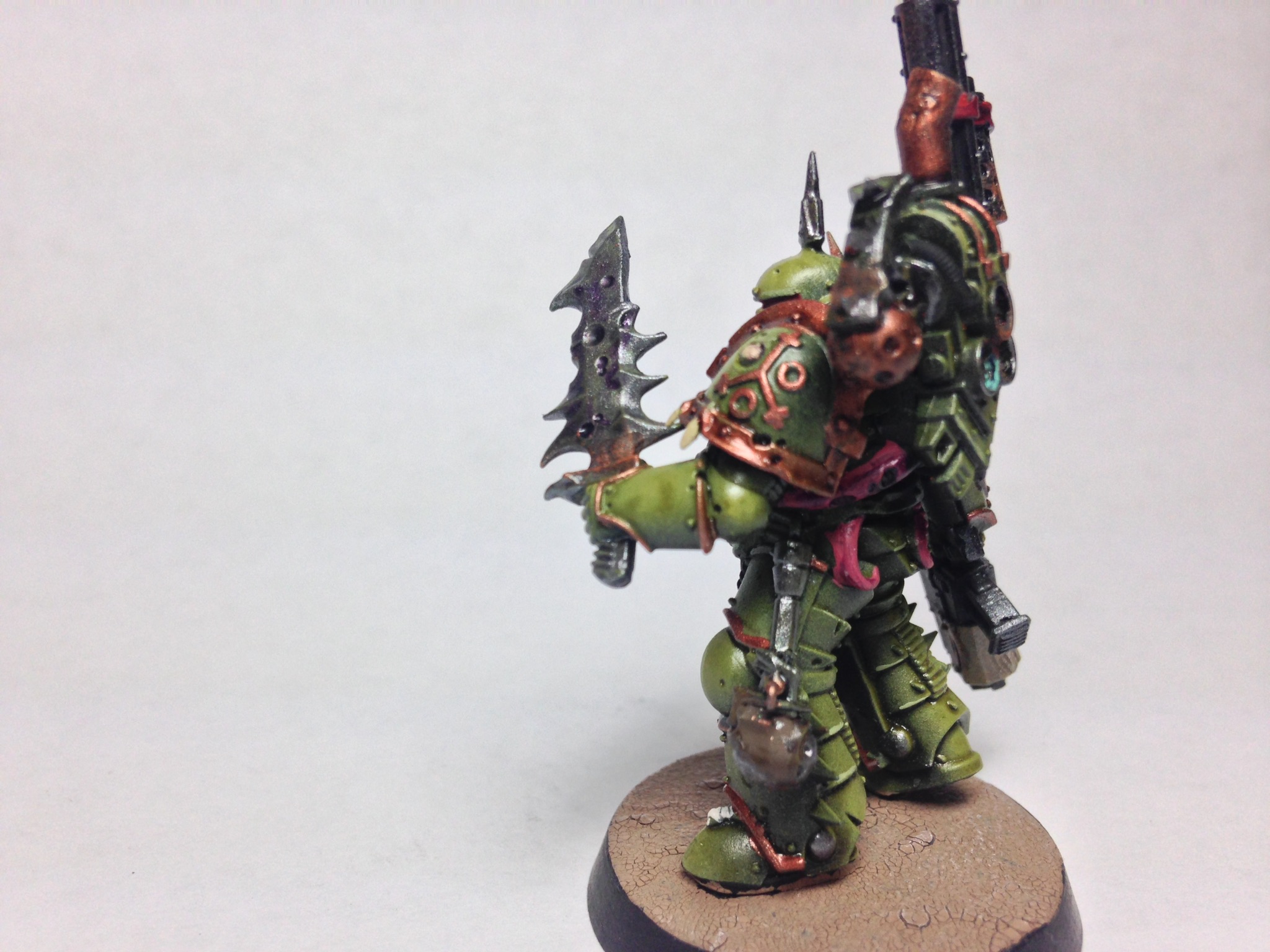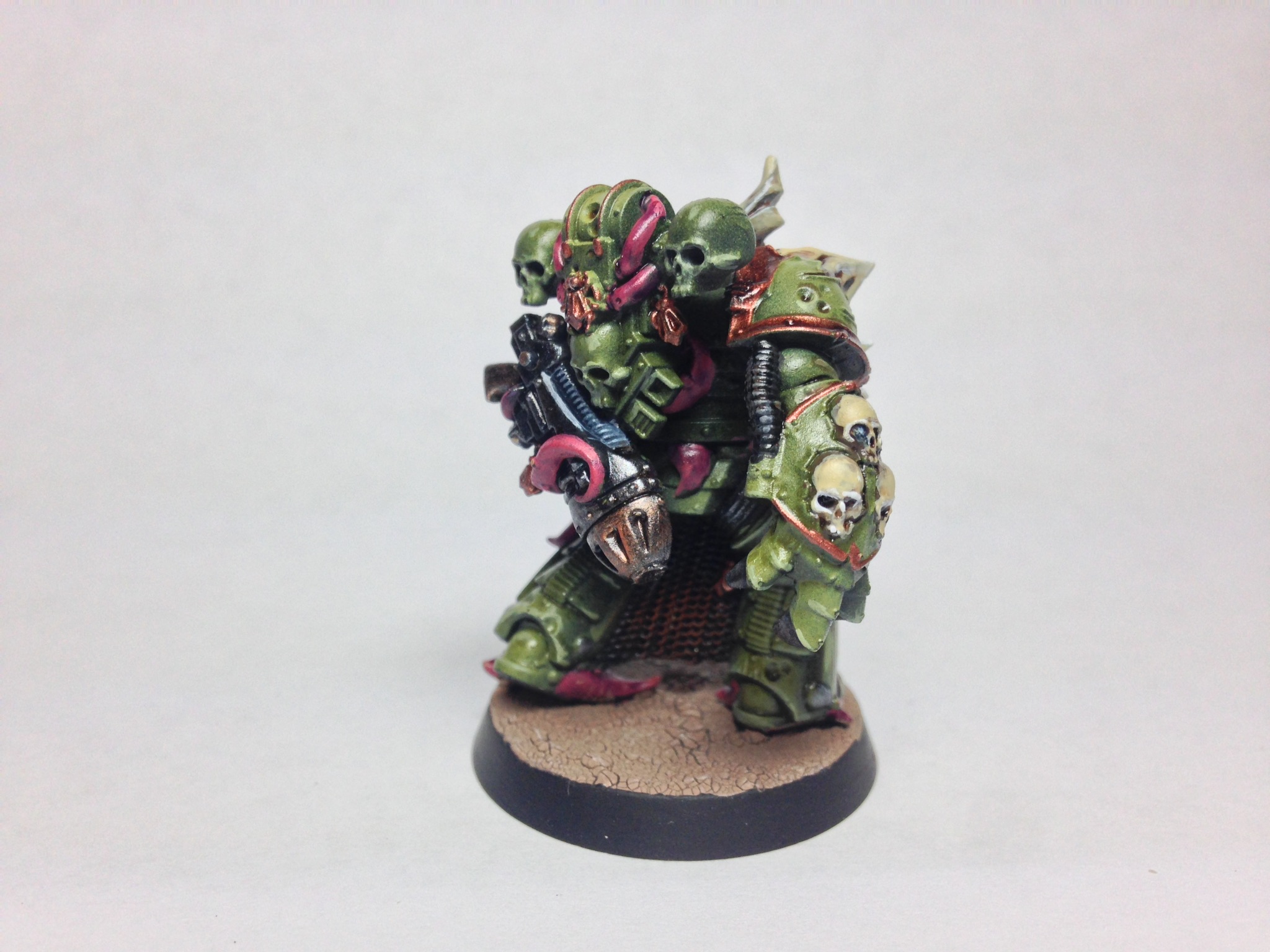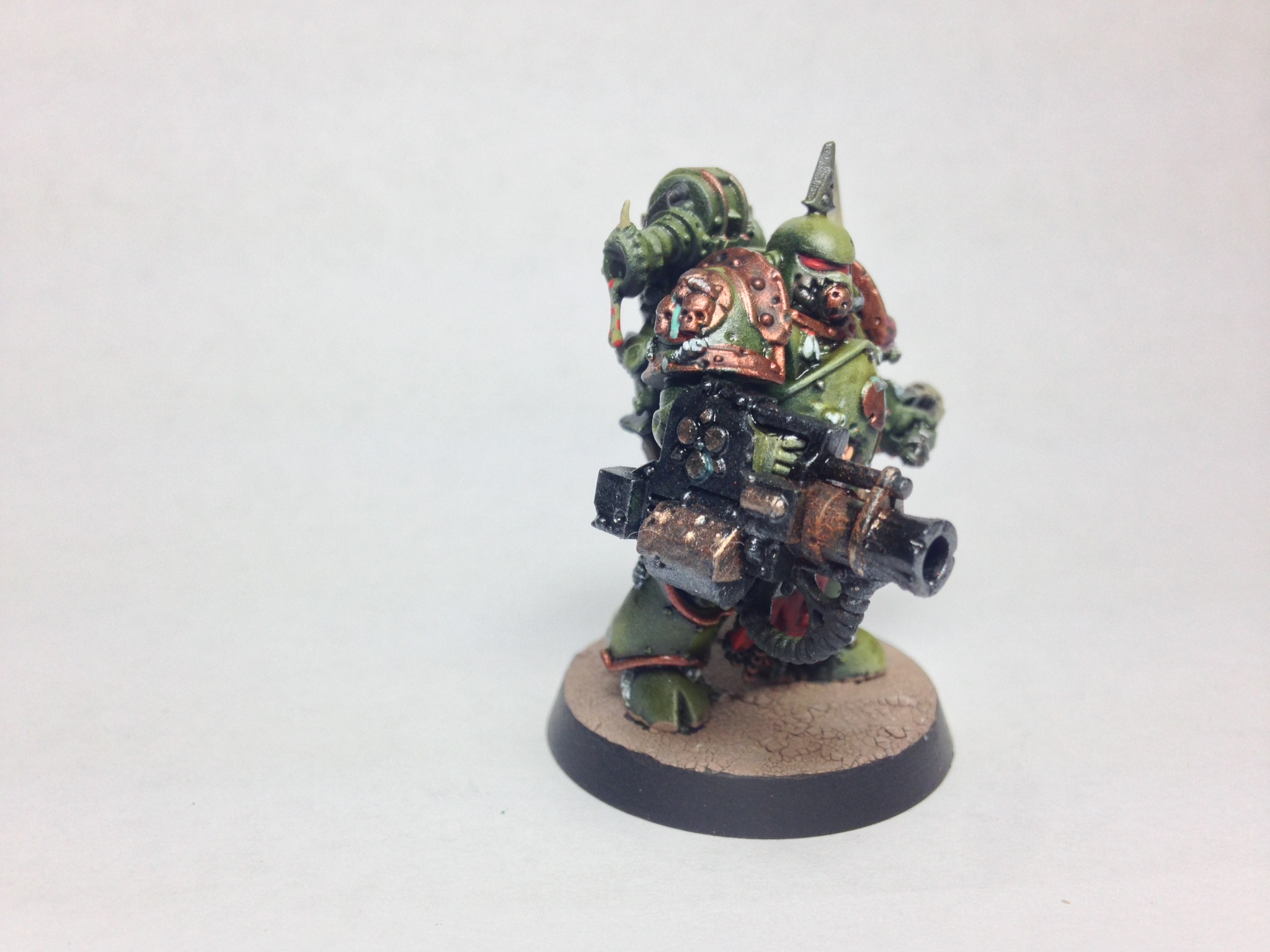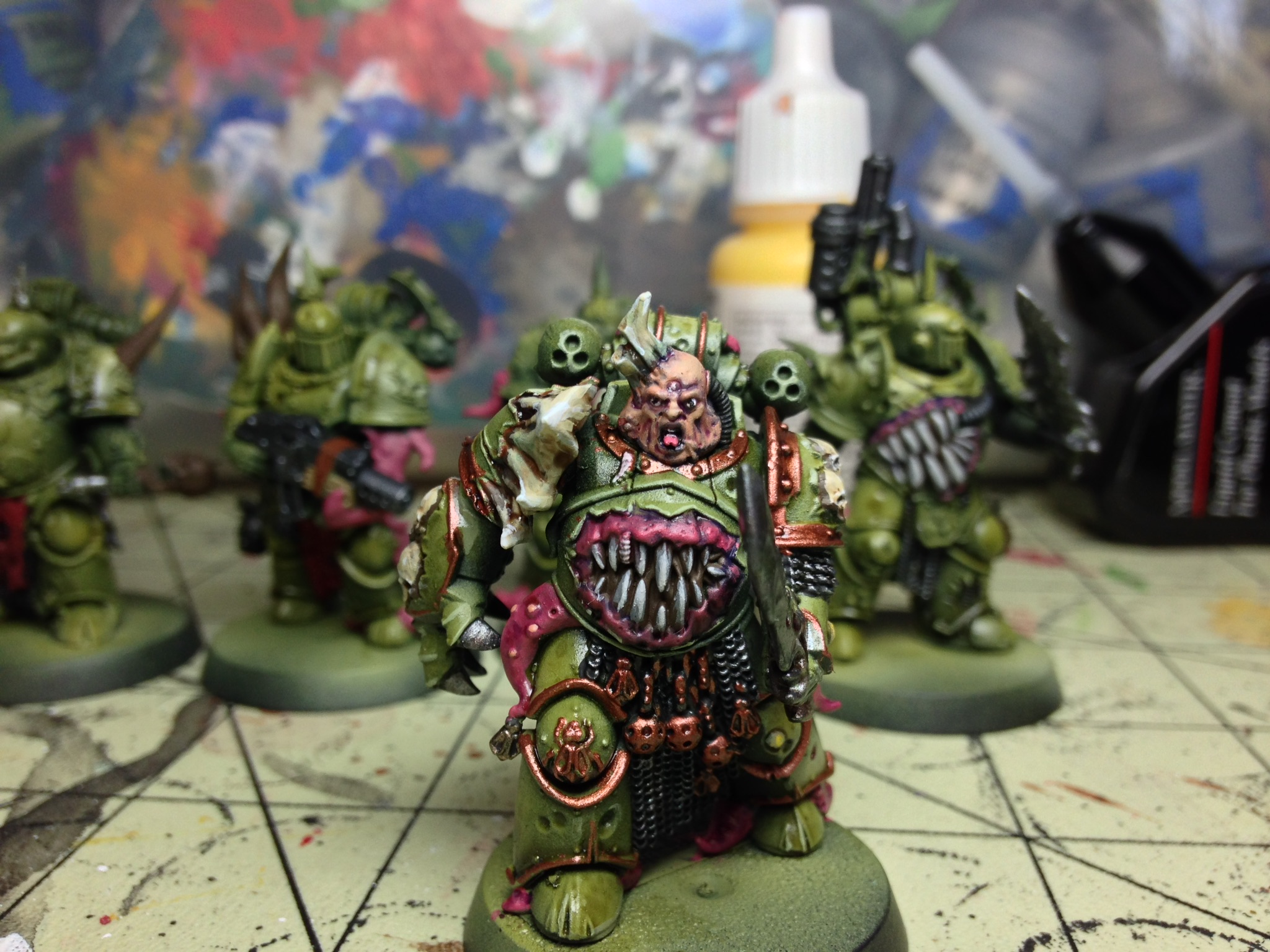 That's lovely green, but maybe a tad too 'clean'. have you considered adding a yellow or brownish hue to the green? Not sure if that's possible with them being airbrushed and all, but I feel the green looks different from the one one the death guard. May just be the lighting though.