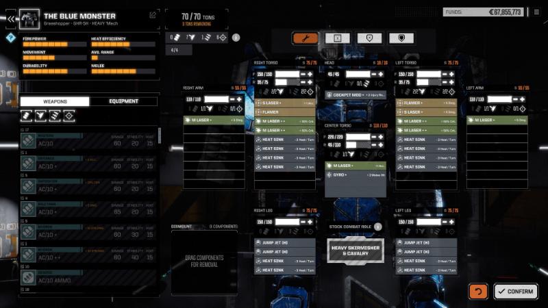 Sweet. I lucked out and got a Grasshopper early and he is absolute death. I kitted him with max small lasers, a flamer, and then medium lasers (and I think 1x LRM5 just to chip away at evasion). I usually get him up to mechs as close as possible and them melee and cook them.