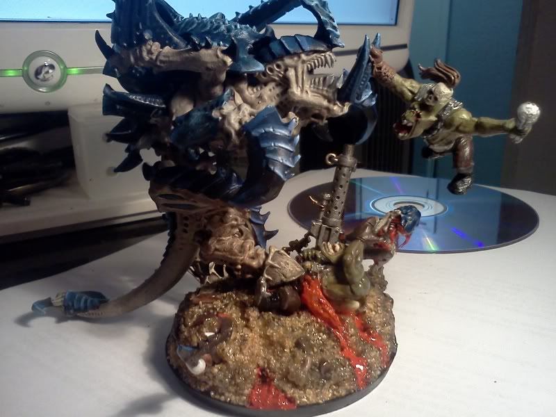 i used blood red and brush on water effects over the blood red to give the a wet shine here is an ork that i mixed water effects and a bit of blood red to make the pool of blood the war boss is standing in.
