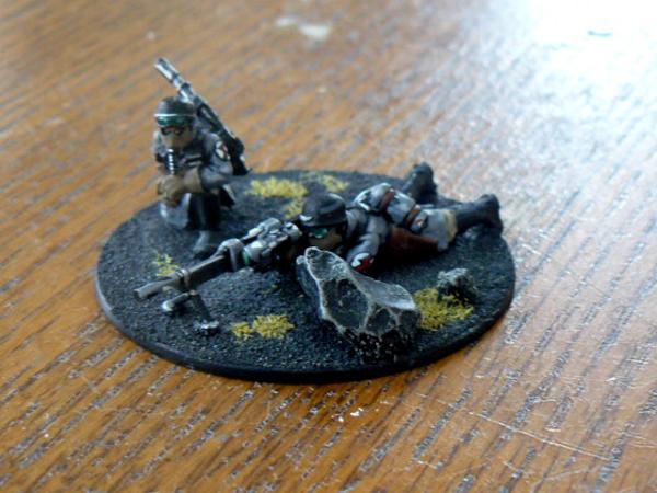 The "sniper" is a conversion of a standard Heavy Bolter Gunner with what looks like the top rail from a Cadian Lasgun, the body of a meltagun, and a barrel from one of the sniper models(either Larkin or Scope) from a box set.