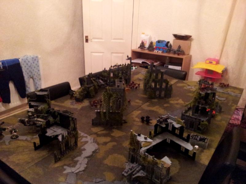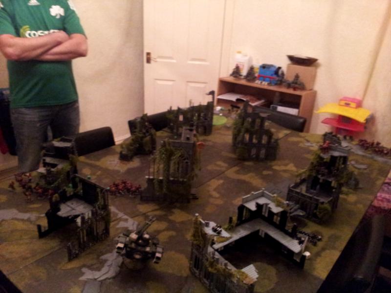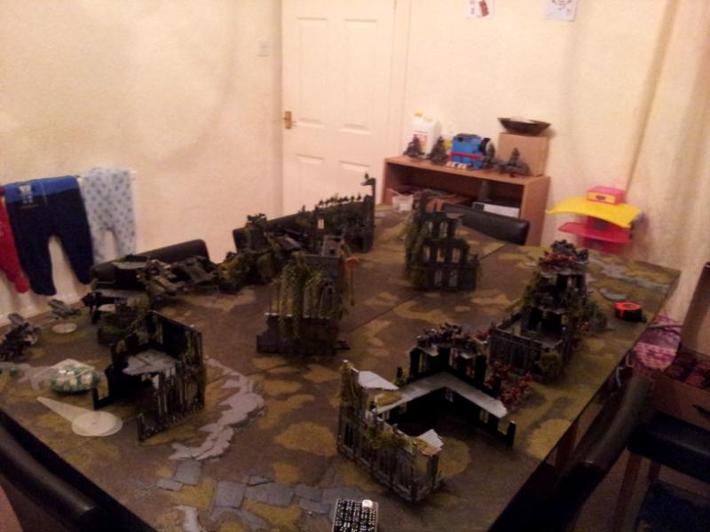Poddy is getting better each game. I think his deployed was almost spot on as he put most of his vehicles in the centre, which means I had to get past them to get into assault - though his mistake was moving some of them away on his first turn. He also missed some of the windows in the ruins (I've done this) which let me draw
