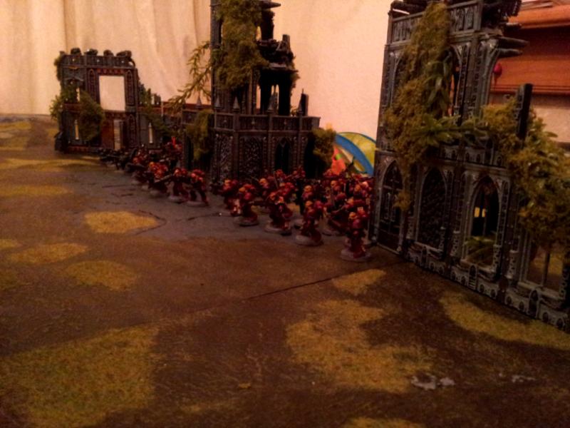 El, Librarian casts unleash rage - the Tau are wiped out thanks to mass power weapon wounds and armour saves. Squad then consolidates 6" towards the Kroot.