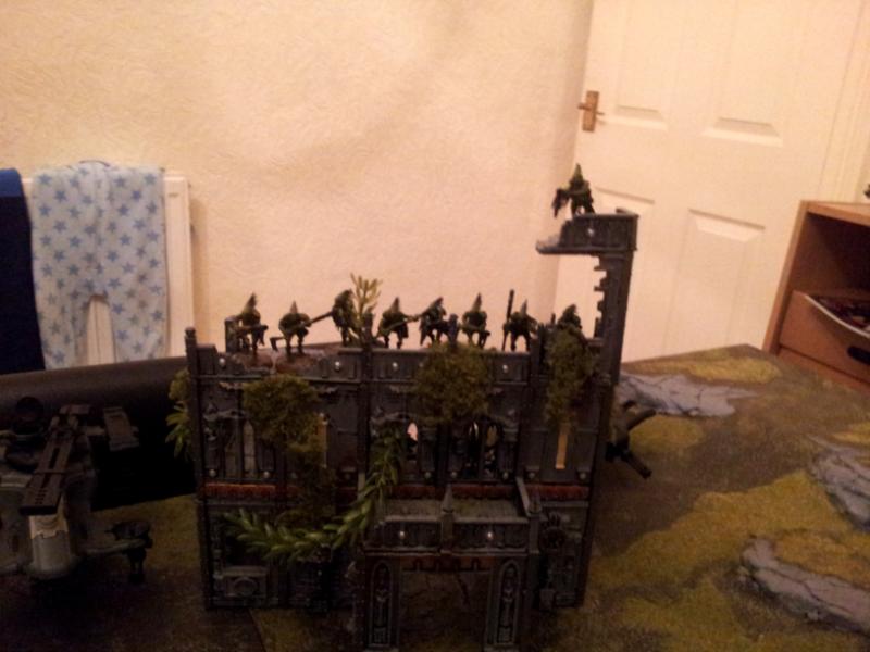 Devs fire at the unit through the windows of a ruin. Scouts attempt to blast a unit of Pathfinders, they are out of range by 3".