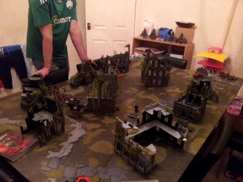 I won the roll off and decided to go first, I want to be in assault a.s.a.p and not standing there getting shot. I deployed all my units in the centre, melta units at the front with the Honour Guard in between and then the two flamer units behind. In a tower ruin in the centre of the board in my deployment zone I dropped down two