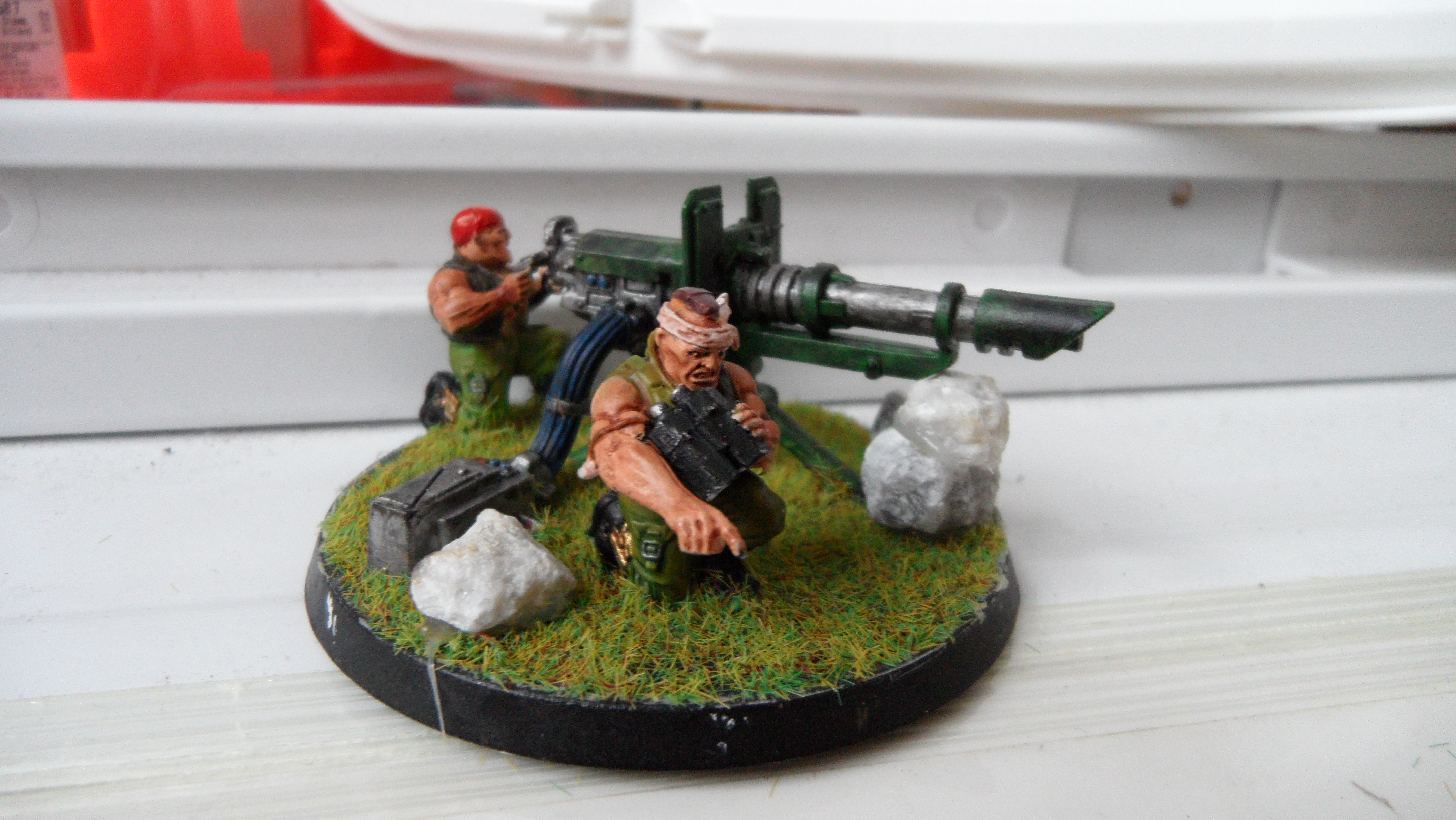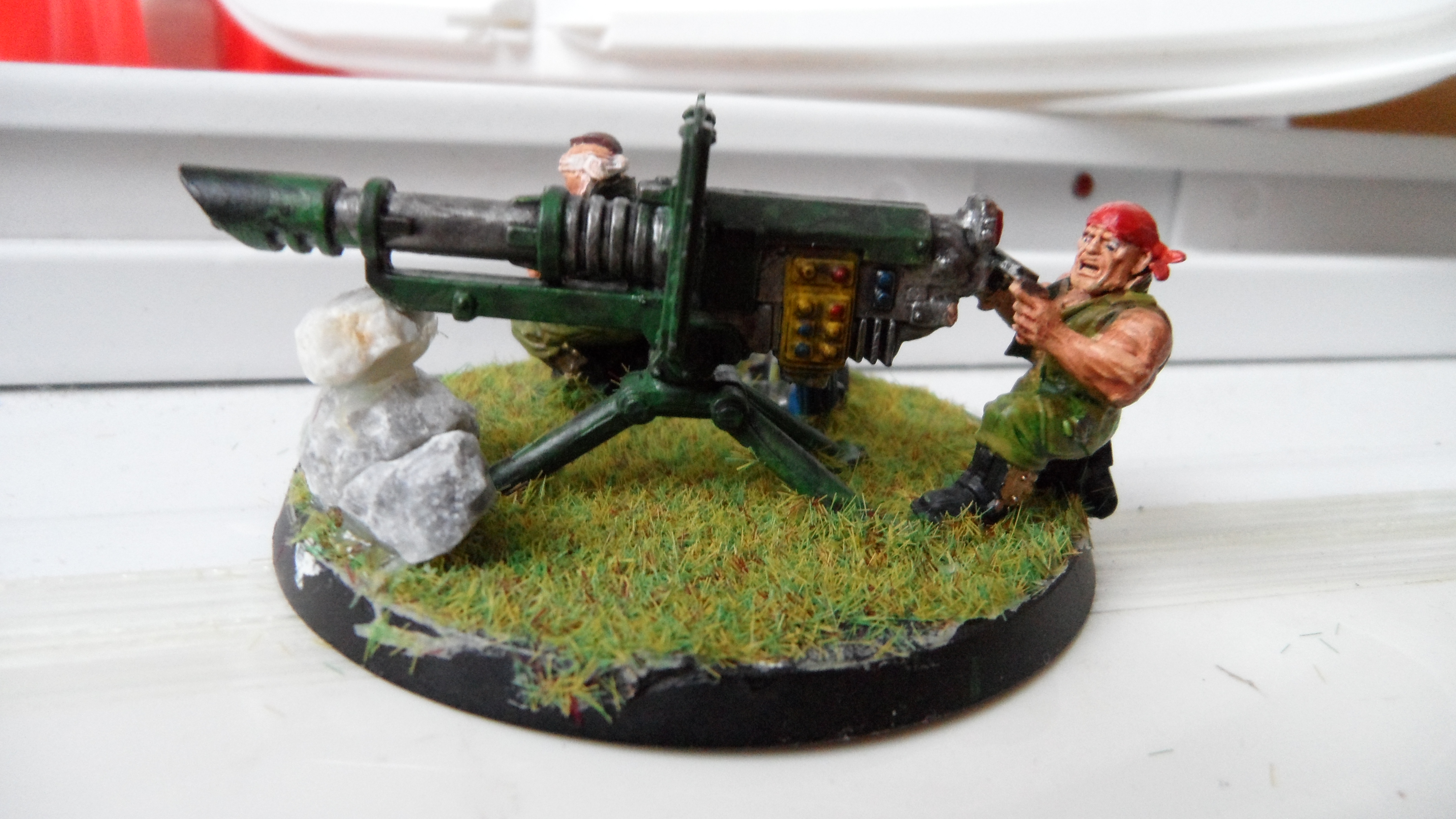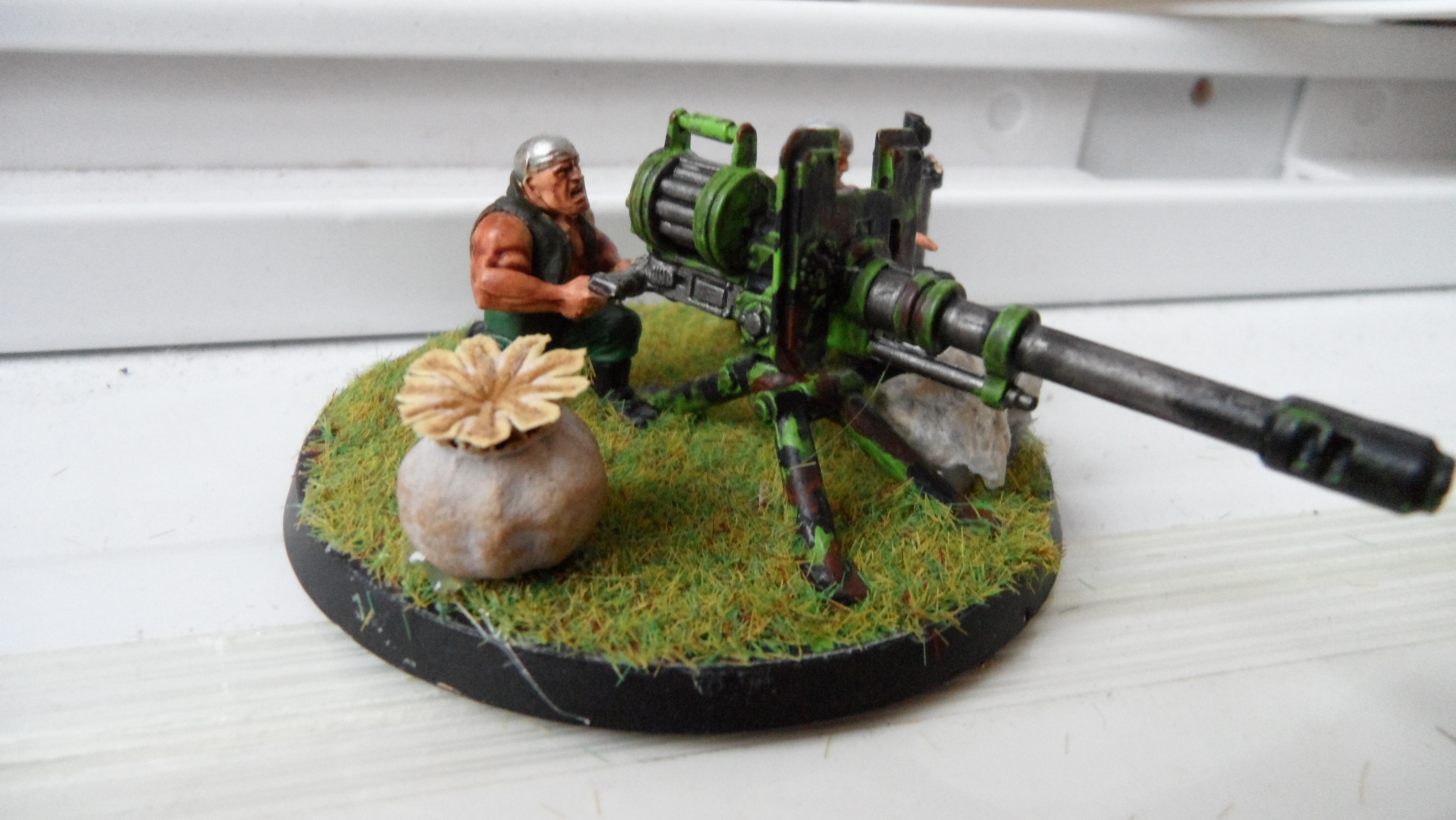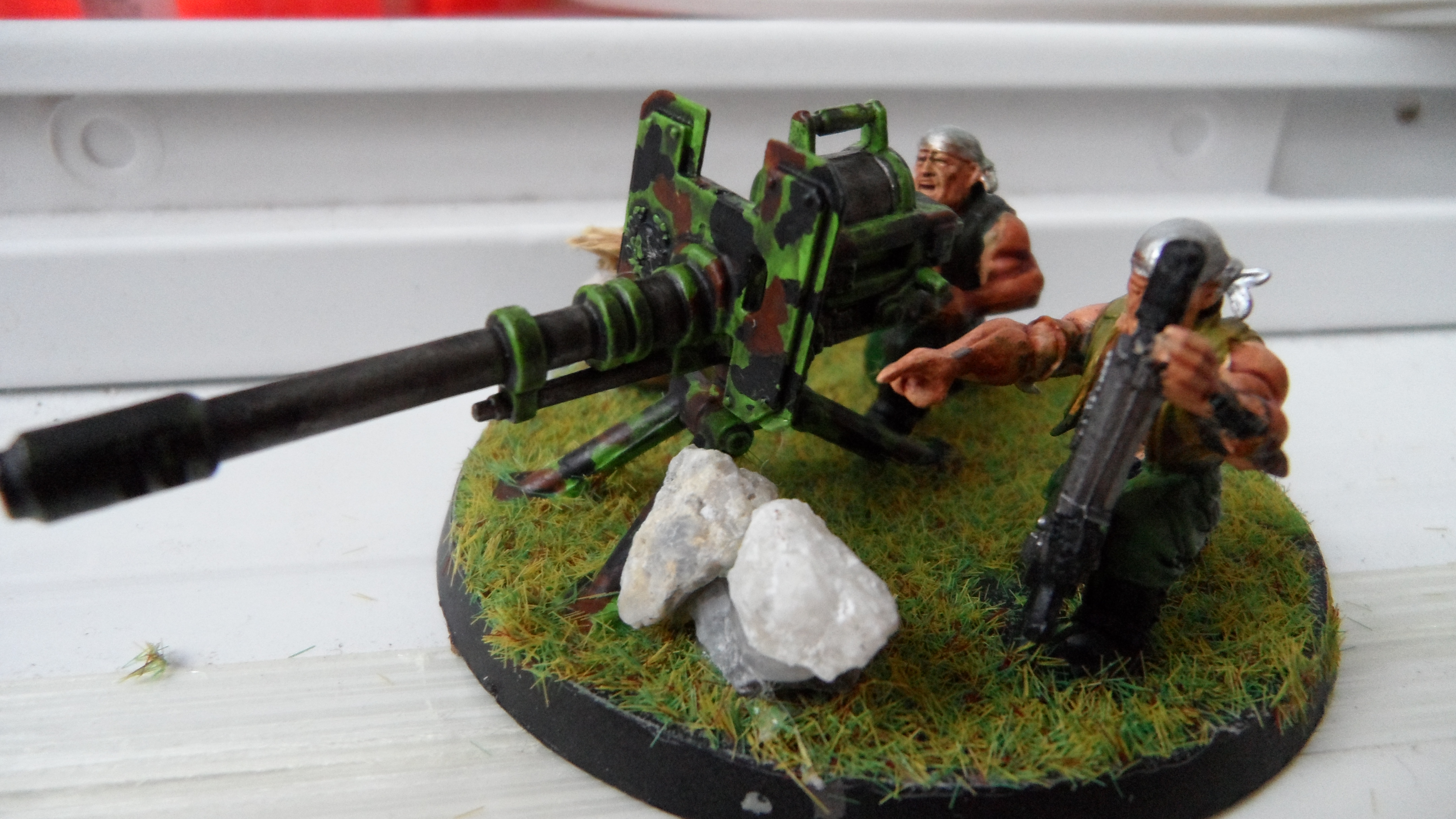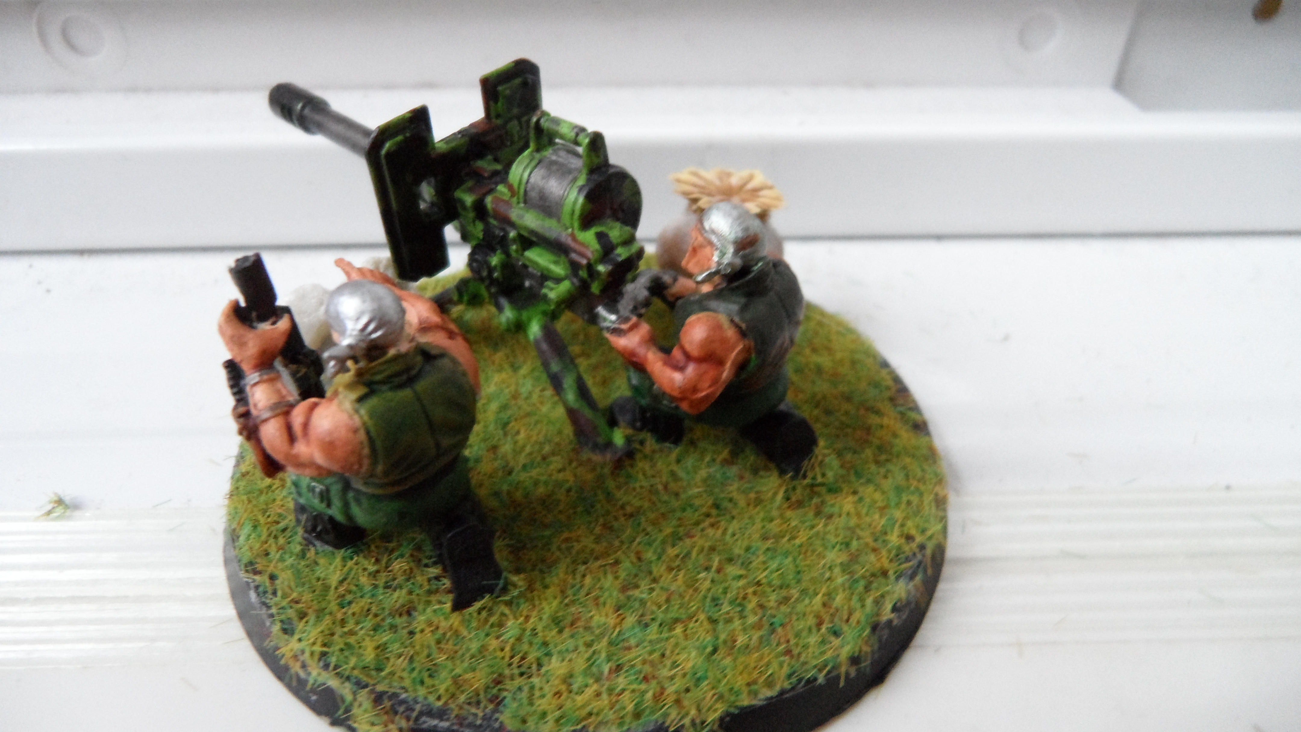 Here are two of my Catachan Heavy Weapon teams. One is a Autocannon the other is a Lascannon. I used the head of a poppy flower to add some flora to the base. Looks alien like