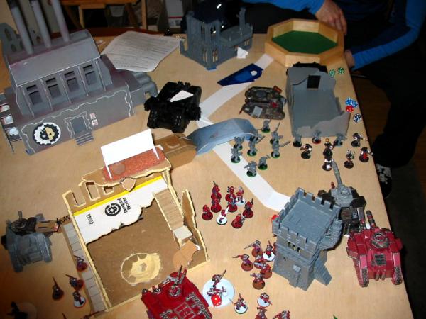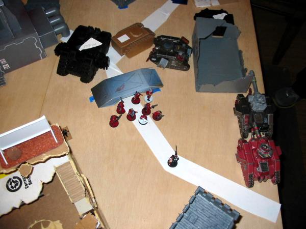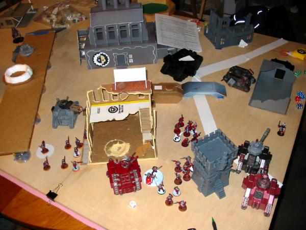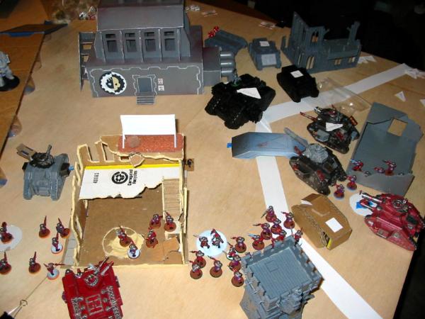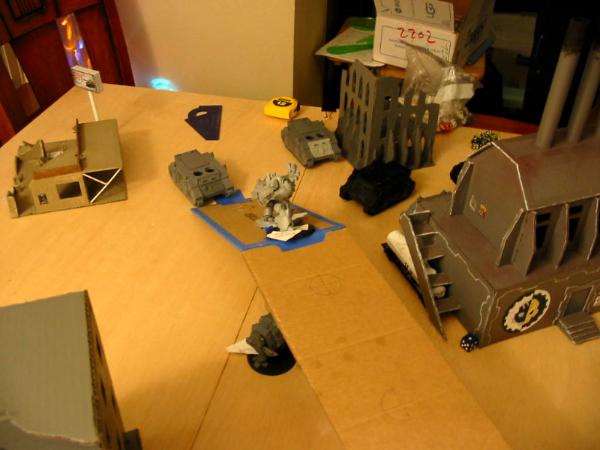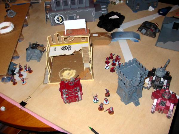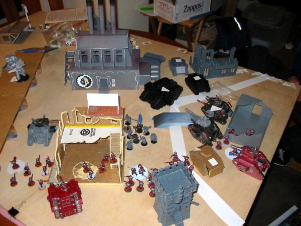 I deployed with the above in mind. The heavy weapon teams went in the building, and I kept the Sentinel in reserve (for flanking and shooting dreads/rhinos in the rear) as well as the Veterans, since I wanted them to be able to respond to my opponent's movement (and there was nowhere in my spawn I could do that and not have to drive through my own troops). Meanwhile, the Black Templar deployed to try to break line of sight to the majority of my forces to avoid turn 1 shooting; he's been on the receiving end of a similar army before and does not like it. He pulled it off very well: anything I could see had enough cover for a save. Didn't matter in the long run, though, since he seized the initiative.