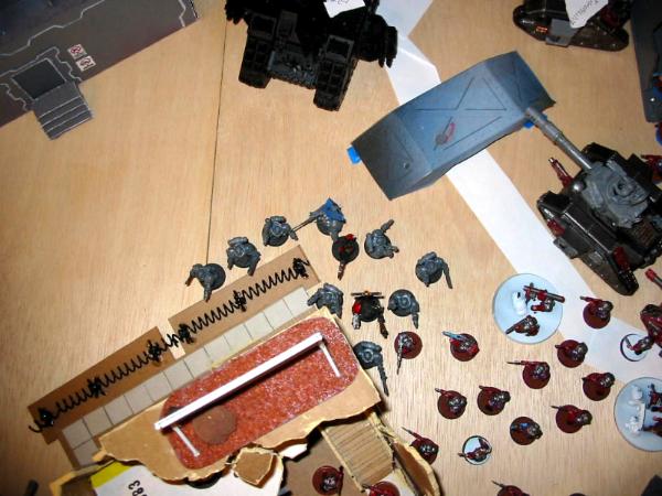 The sentinel and the plasma veterans (that cardboard Chimera on the right) come in, and I flank the former off to the left to pop dreads and move the latter in behind my line to get some support against the brunt of his push. Meanwhile, the tanks maneuver to get better shots, the majority of which is going to be directed at the