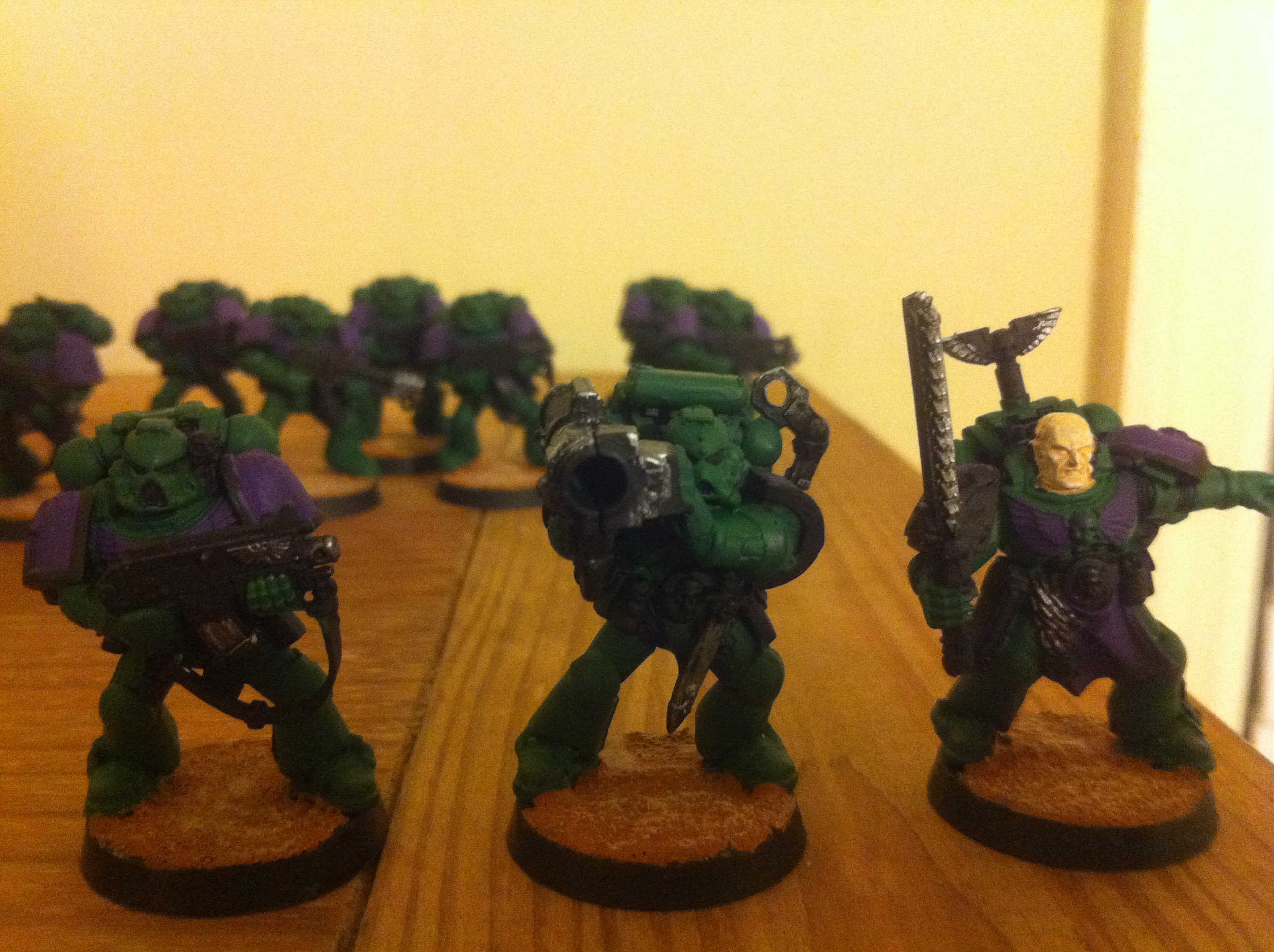 Okay, so I'm painting my first squad and I've gotten to the point where I'm not really sure what I want to do with it. Most of the major/easy stuff is done, but it definitely needs touching up, details, finishing touches, etc. The Captain especially isn't finished. What should I do? Here are some pics: