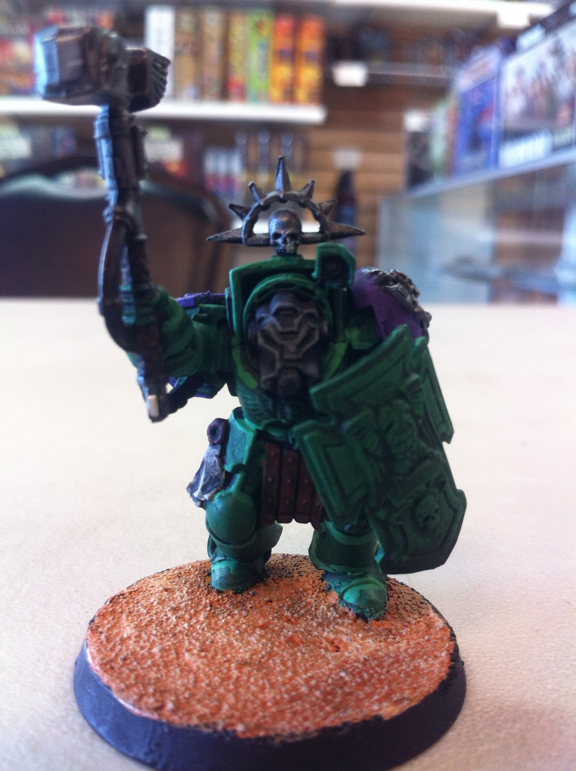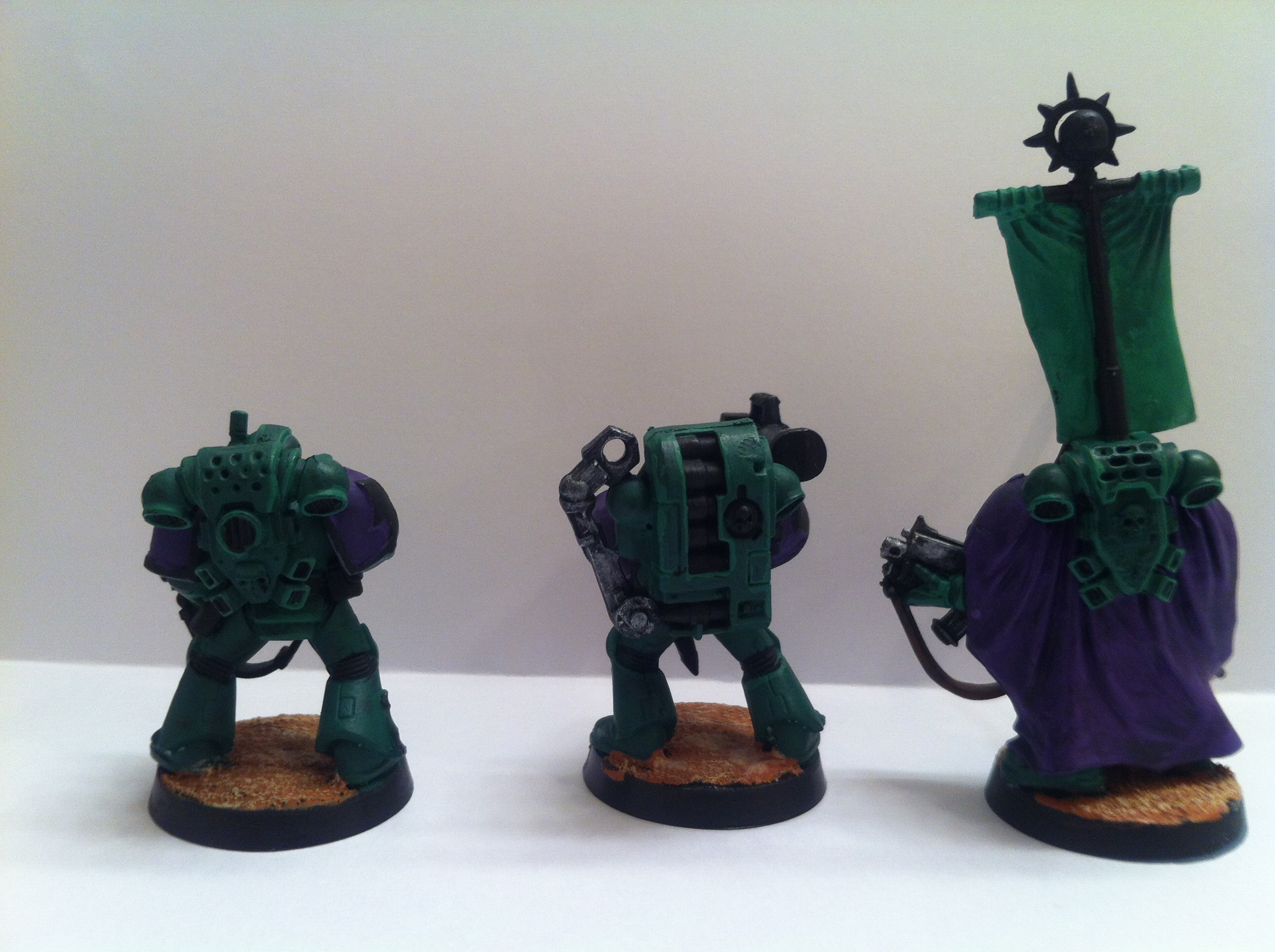 Love the colour scheme. Is that Dark Angels Green, Liche Purple and Scorched Brown?