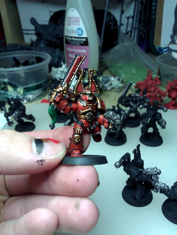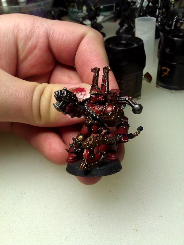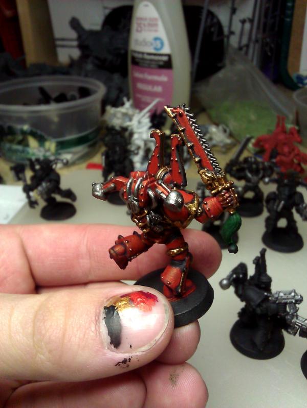 Thanks all for the tips. Per TKG's suggestions I attempted the 50/50 highlight mix but as Deefect pointed out the whole model already has a slightly orange tone so it didn't really pop unless it was blaze orange by itself, which I didn't really care for. I'm starting a 2nd attempt and this time instead of painted all the plates over this the blood red, I'll just try to use it as the highlight after the 50/50