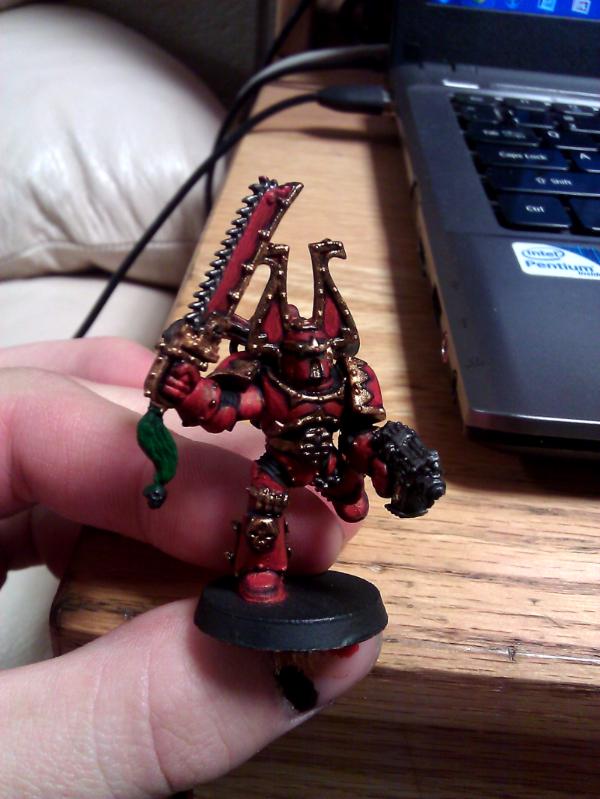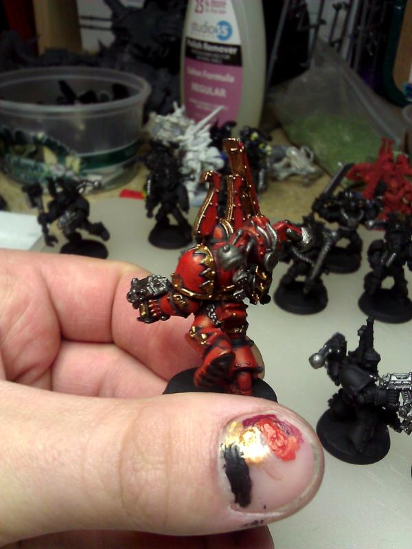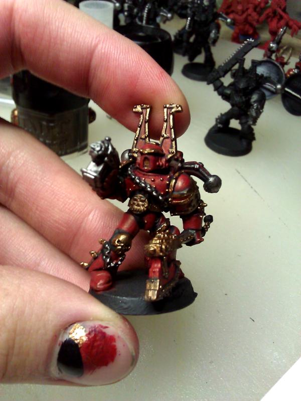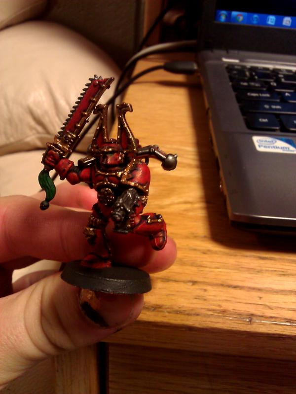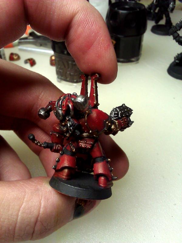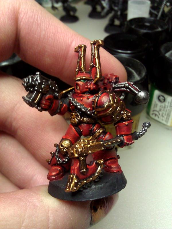In the end even with only using the blood red as the highlight it still comes off as a bit orange to me. I may just try to scale everything down a shade darker and use the 50/50 to highlight, or do it the same, but use a 4th/5th layer of the 50/50 red mix for highlights. The brass came out better and is nearly there I think but still a bit too much of it, I may just try painting a bit less of the trim in brass.