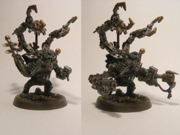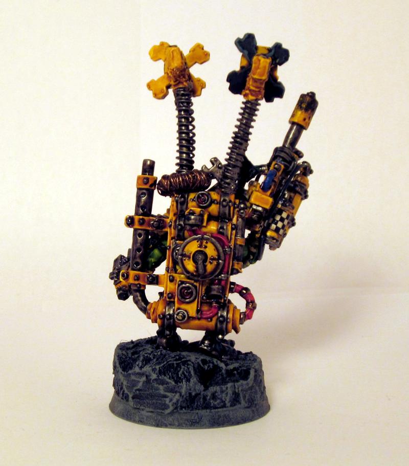I started with a body from the WHFB Black Orks, added the backpack and head from a standard mekboy, one arm has a twinlink dakkagun from the warbikers box, and the other arm is the buzzsaw from the painboy. The shoulder plating over the buzzsaw arm is the armour for the front wheel of a warbike. I then greenstuffed a battered iron gob on him, and gave him an antenna propped from his back, but I don't honestly know where I got that bit. To date, the antenna represents his KFF, but I don't really feel it has as much presence as it should. I'm considering doing a more conventional apparatus behind him at a later date.