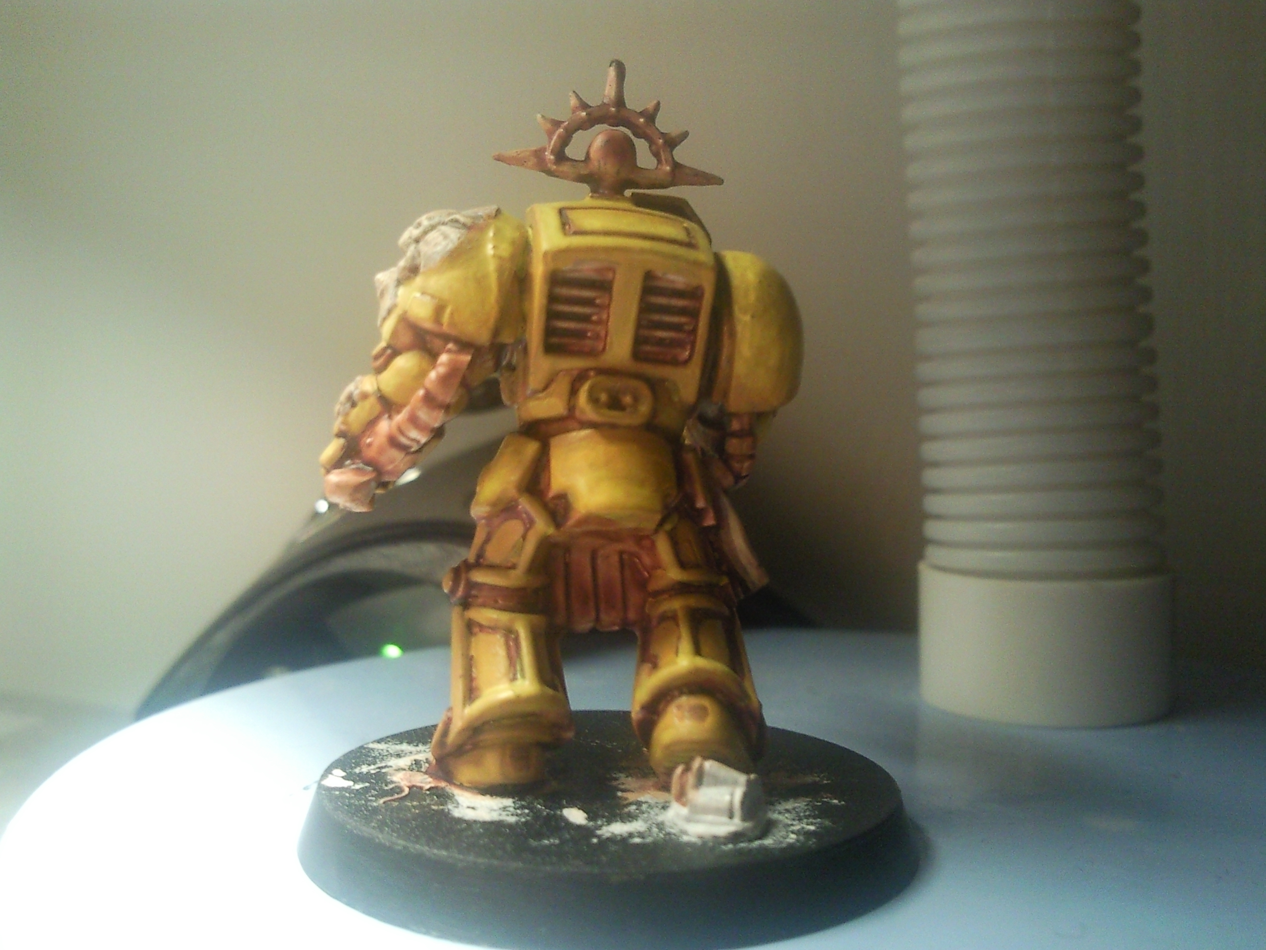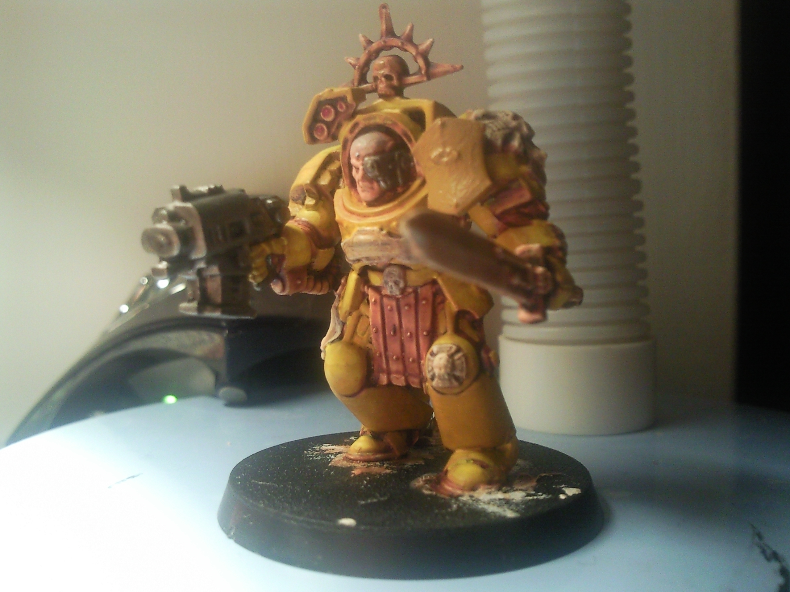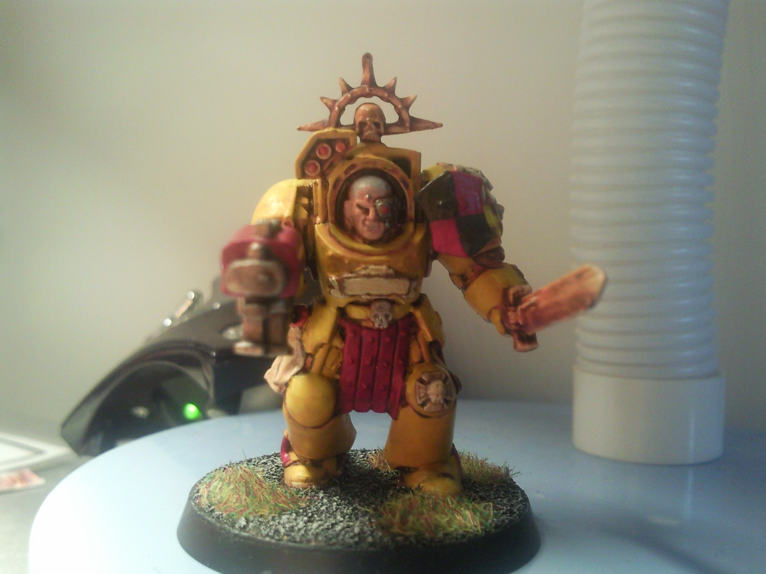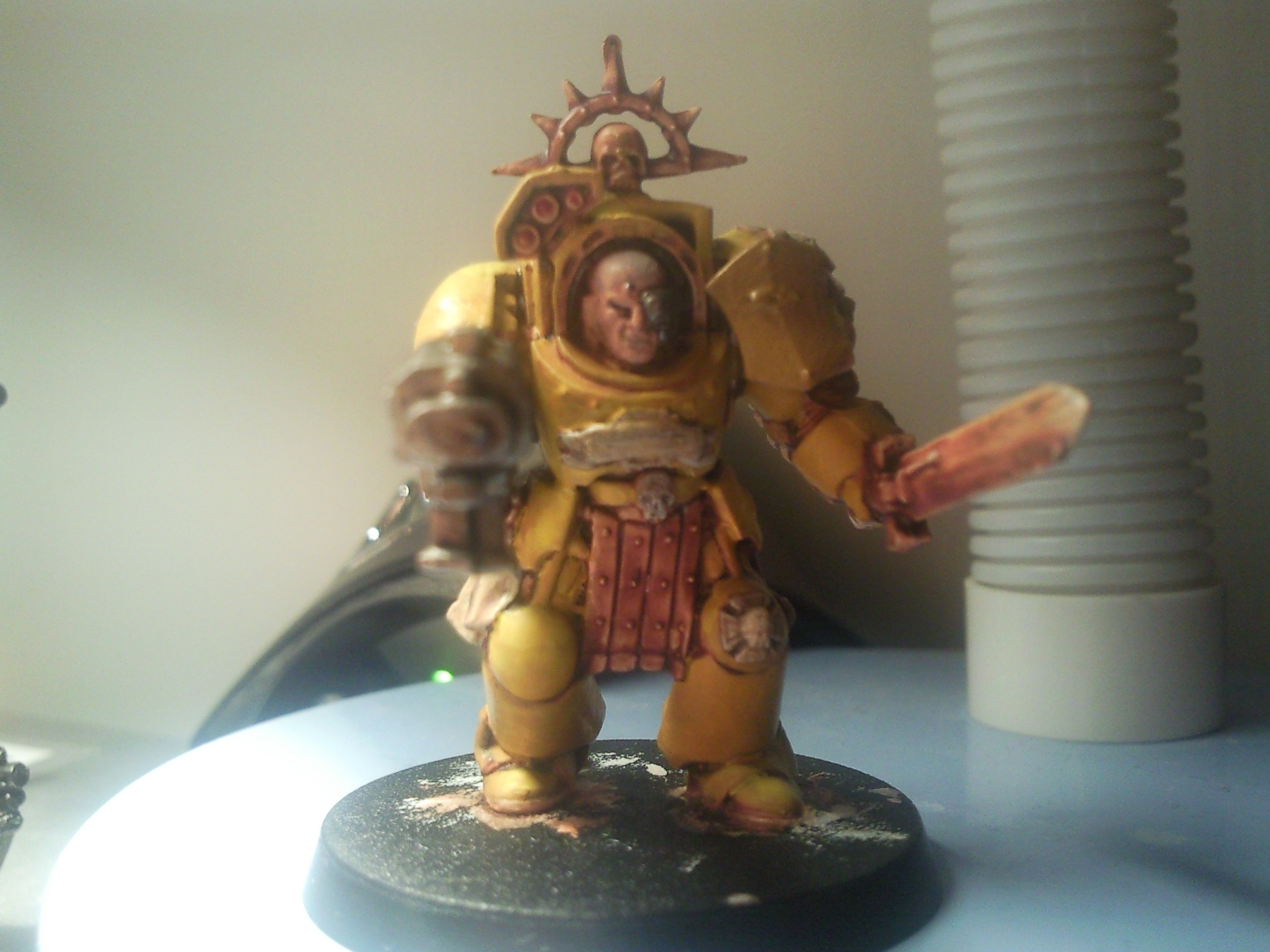 If i can remember right the basecoat for the face was dwarf flesh mixed with bestial brown and a little bit of water. Then the second coat was dwarf flesh with a bit of water then the highlights were done with dwarf flesh mixed with white then a final highlight adding a bit more white again. The stubble on the head is basically fortress grey watered down and then stippled on the head. When it drys it should be slightly see through creating the effect of a shaved head and i think thats it lol