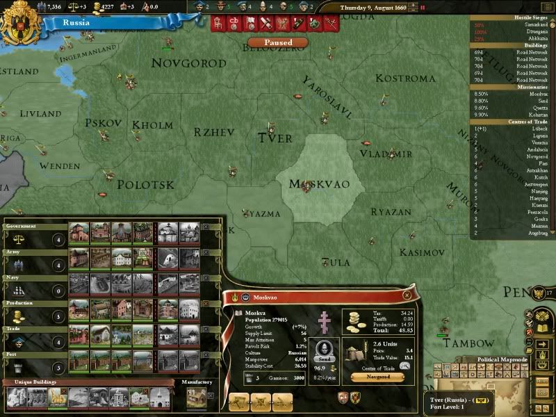 The "stardard" province interface. You can see taxes, tariffs(these are only collected on colonial holdings), production, as well as the religion (that cross thing means they are Orthodox) and the culture, manpower etc.