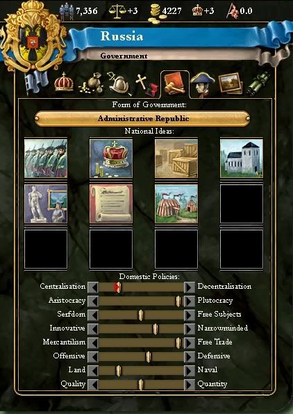 My form of government is Administrative Republic, this a)gives a bonus to trade, b)means i don't have a gakky monarch and c)I am more tolerant of non-state religions (having colonised the steppes there are a lot of muslims in my realm).