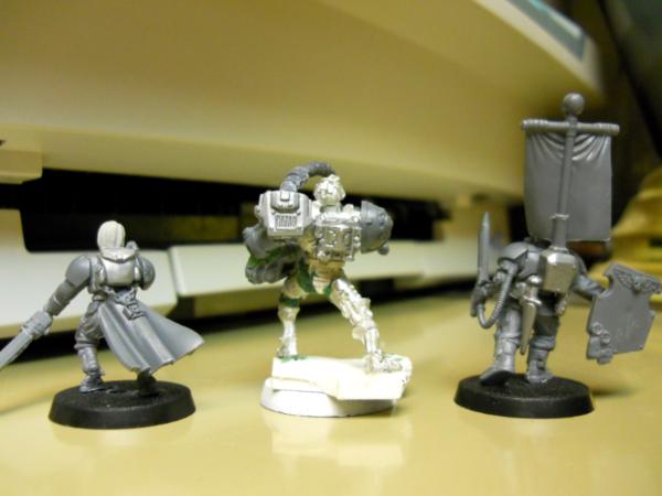 Some crusaders. The Tau-in-poncho was my first green stuff-heavy conversion. Also, I'll probably change out the shield on the middle guy once I get some better storm shields (and I'll take off the rest of the mold lines I see now that I already took these pictures).