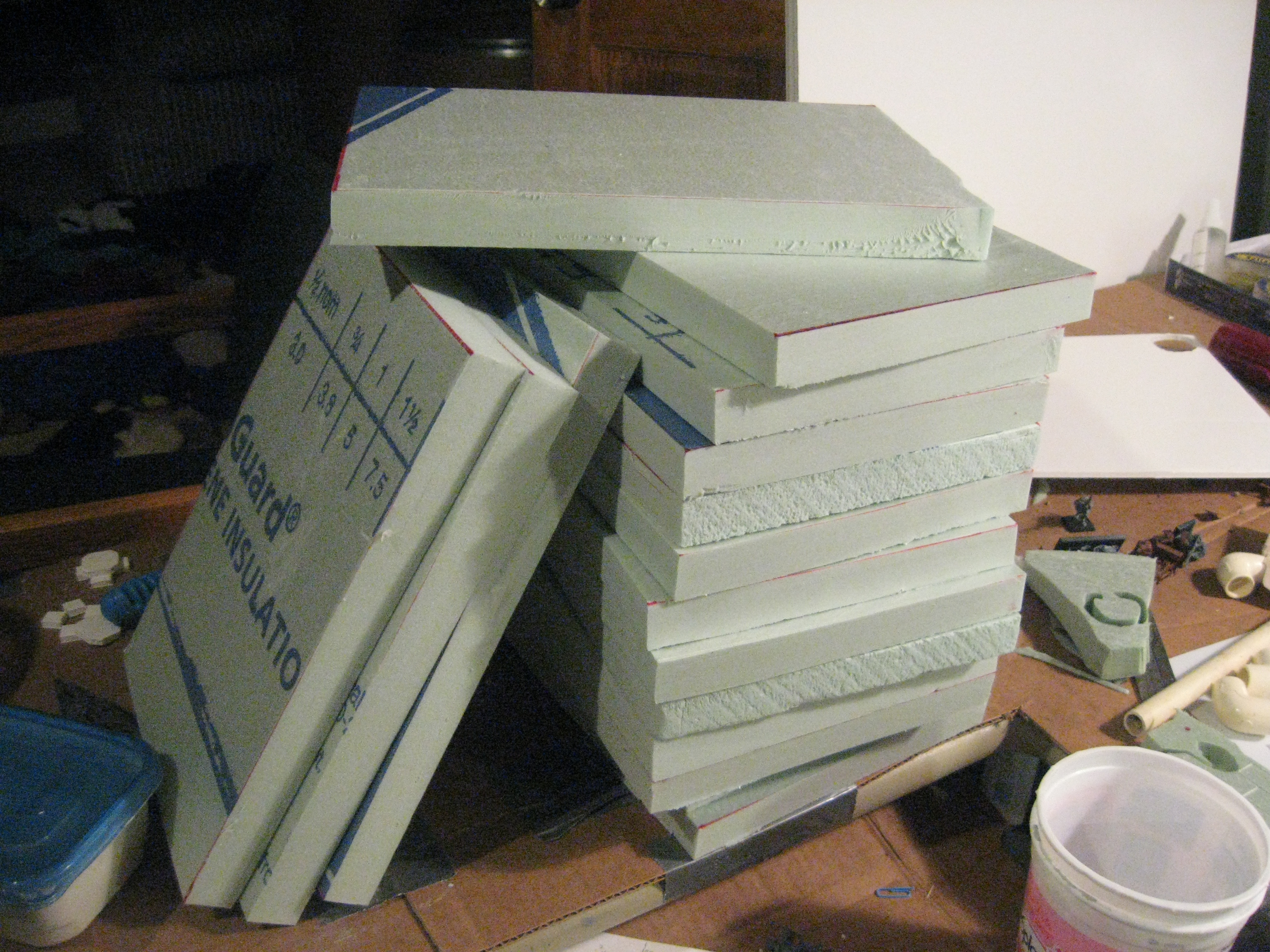 Progress pic: main wall sections 8x12" have been cut out. They will be glued together flat to make a wall section, 2" thick. Ork boy and deffcopta for scale.