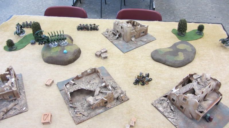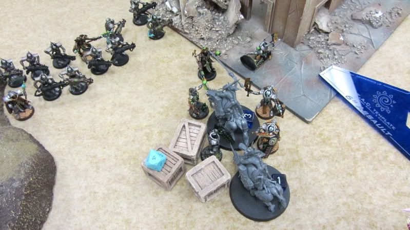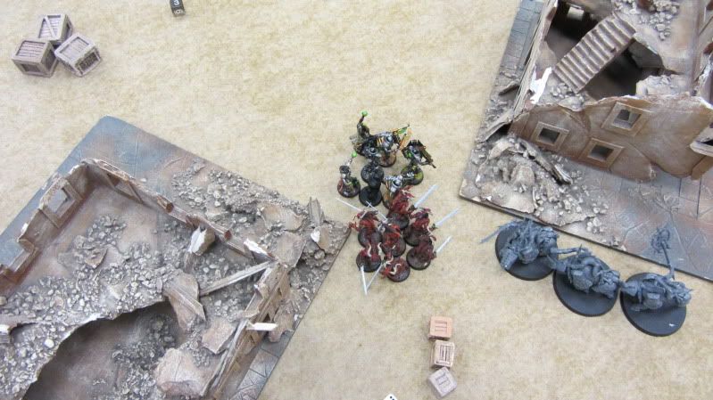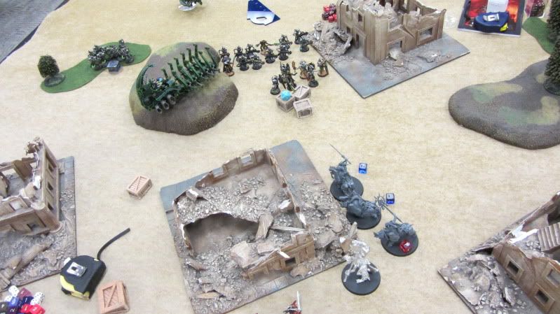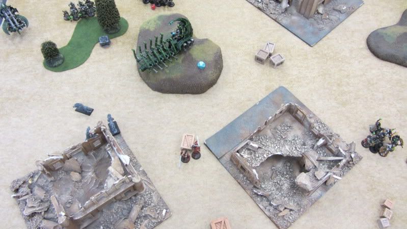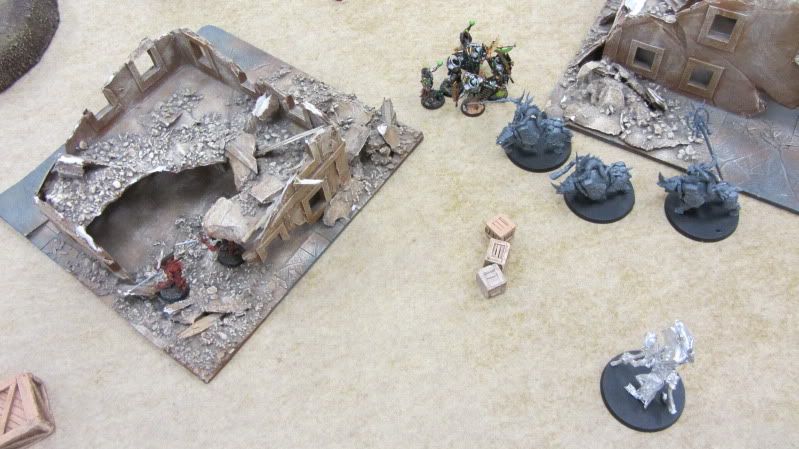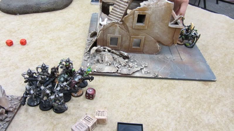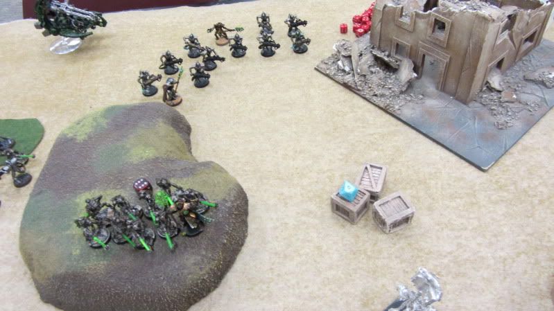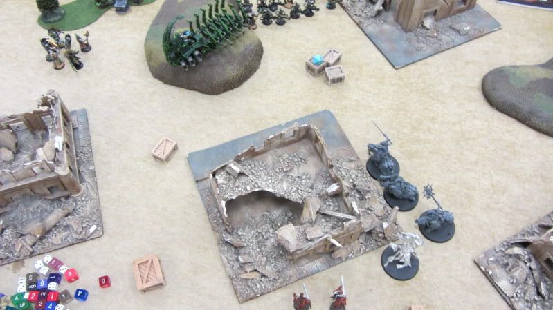 BloodLetters near the objective totally snuffed out. Fleshhounds will actually survive a and only lose one dog, being far enough away from the core of the necron army. The BLs behind the boxes will get reduced to 2, having born the brunt of the GhostArk and warriors inside.