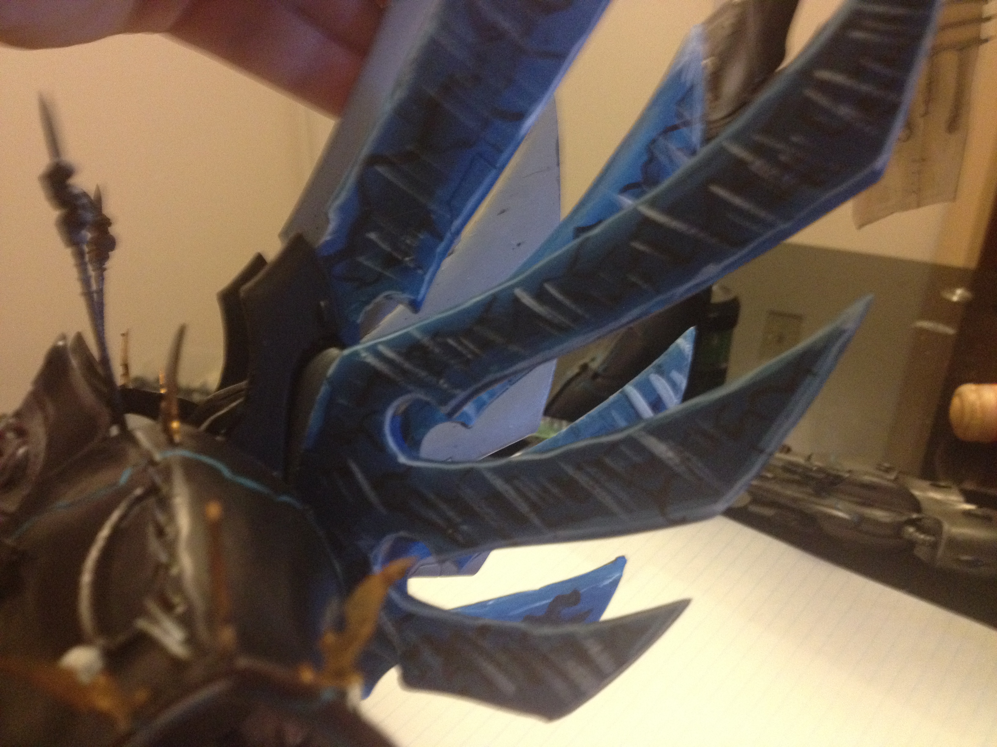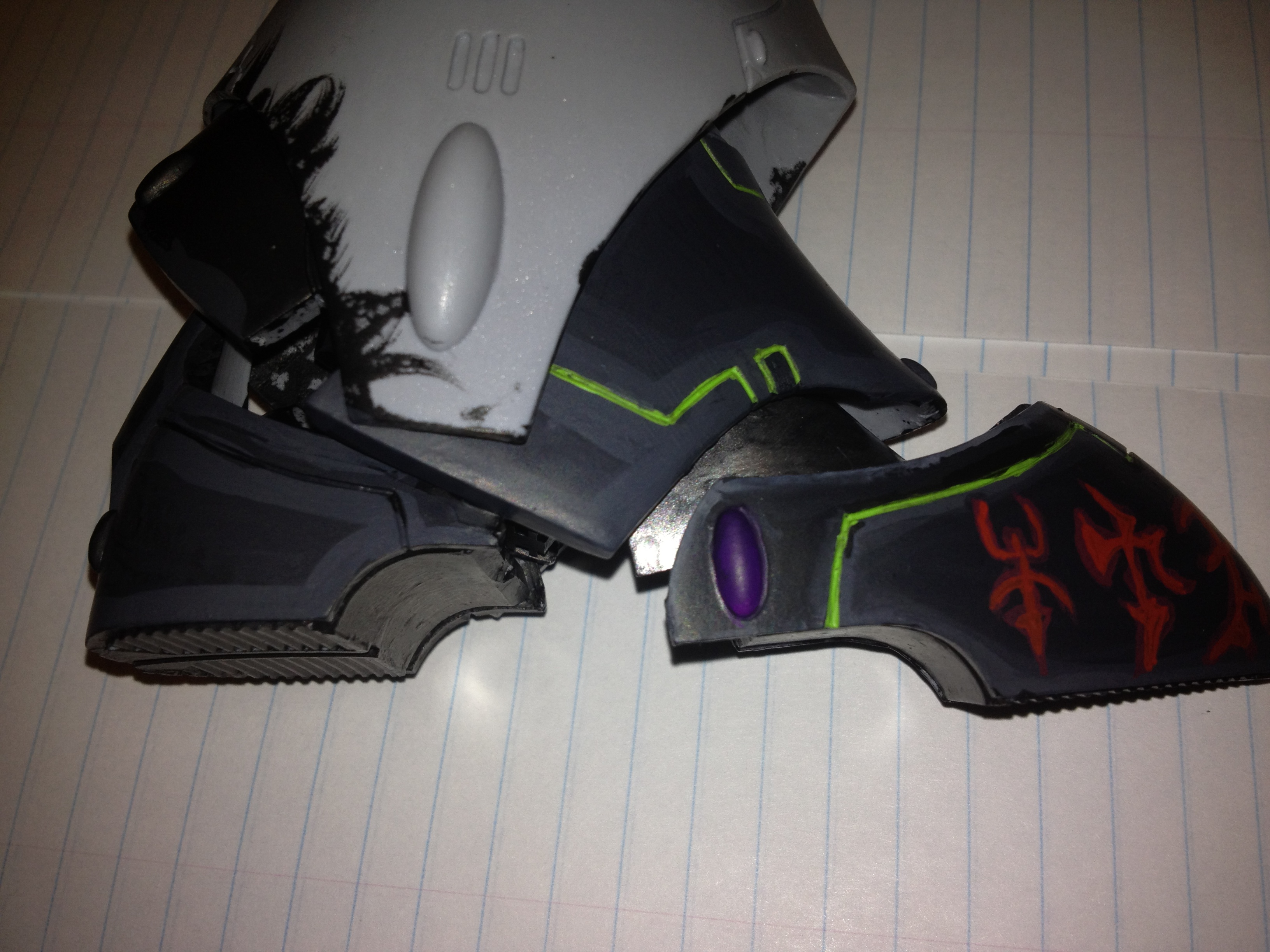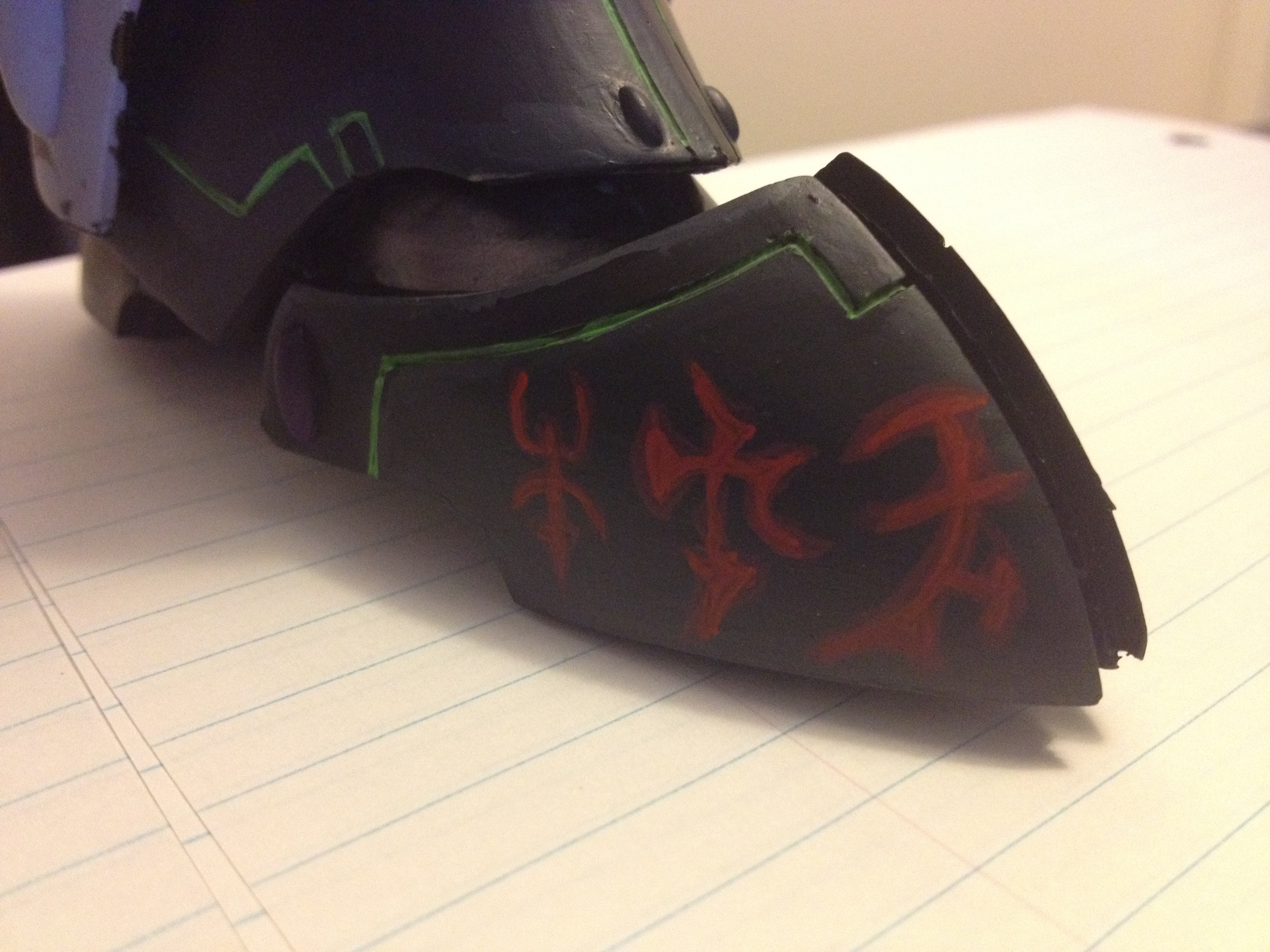 changed the color scheme to a darker metallic, with blue joint lines. looks MUCH better. the black runes also look less colorful and present a darker feel to the model. pictures of the modified leg and knee area in a little bit.