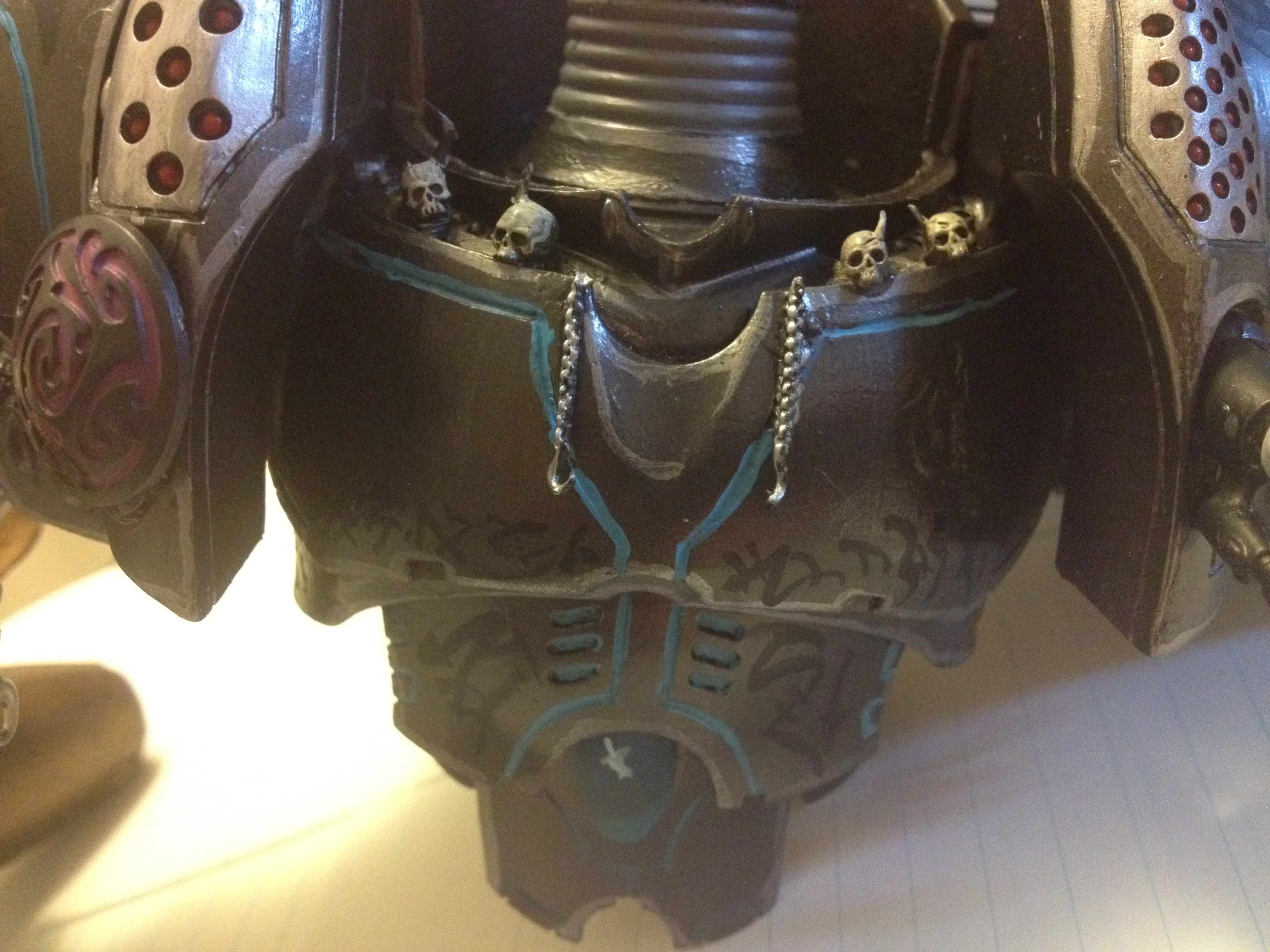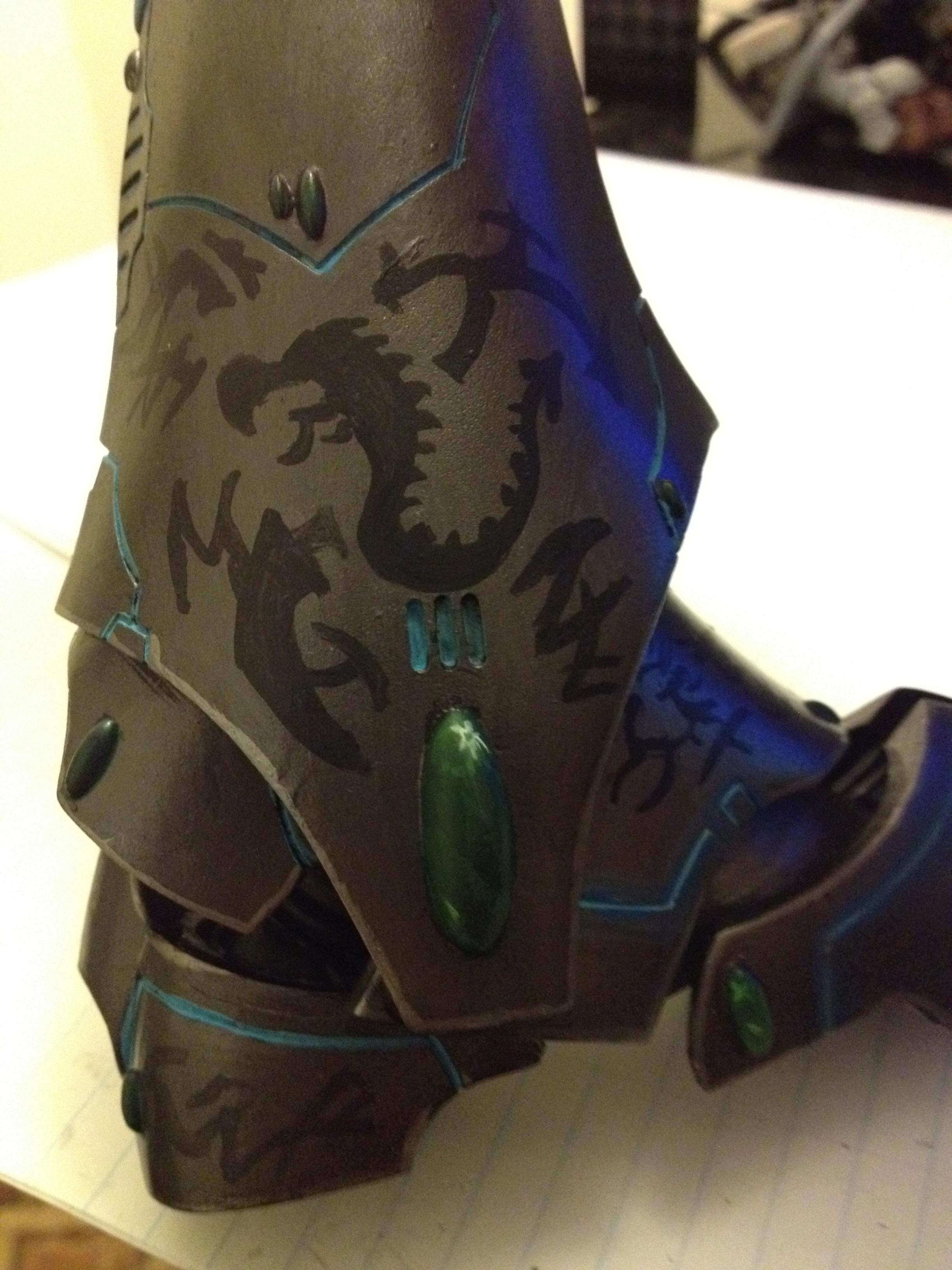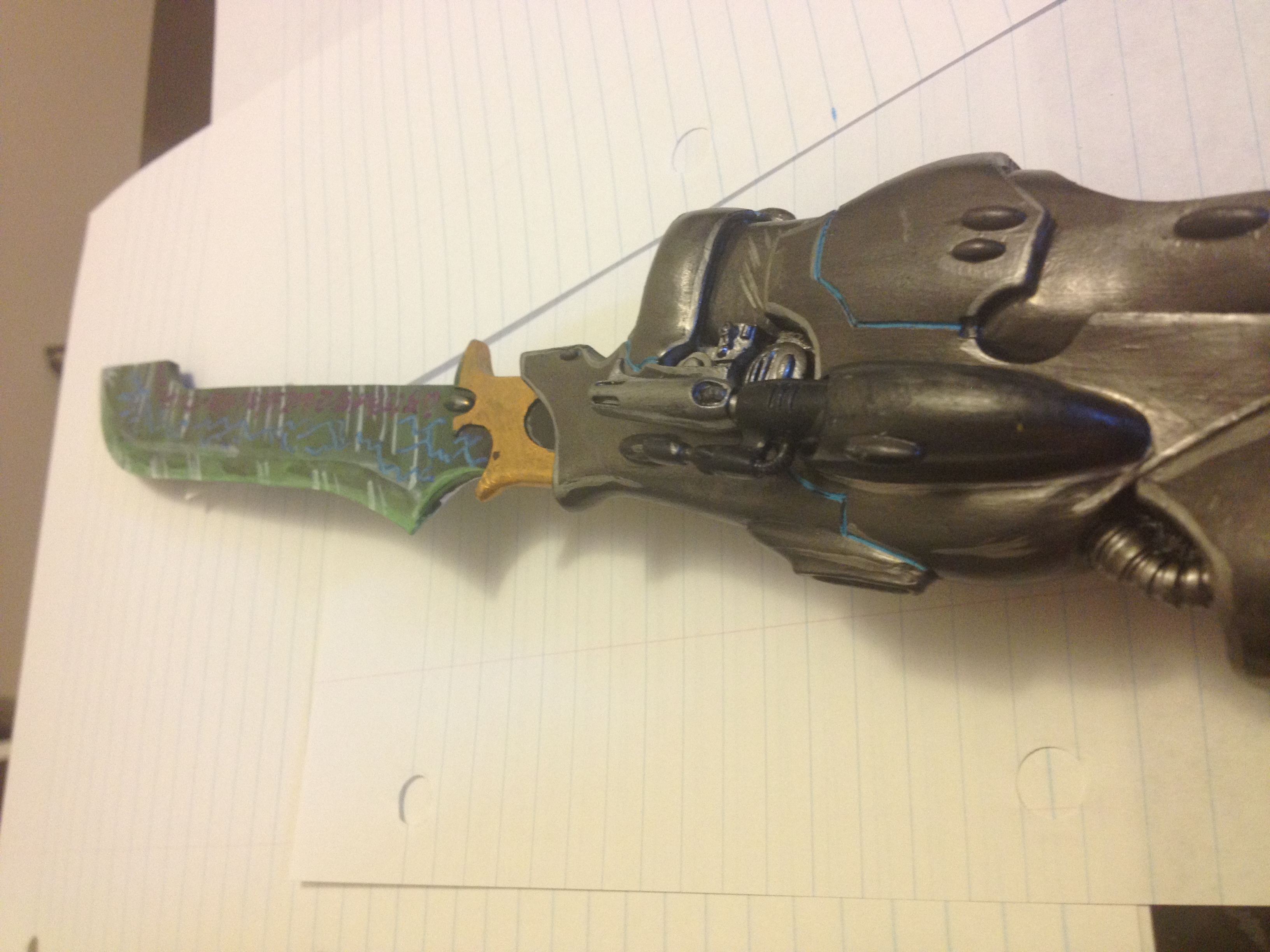 changed the color scheme to a darker metallic, with blue joint lines. looks MUCH better. the black runes also look less colorful and present a darker feel to the model. pictures of the modified leg and knee area in a little bit.