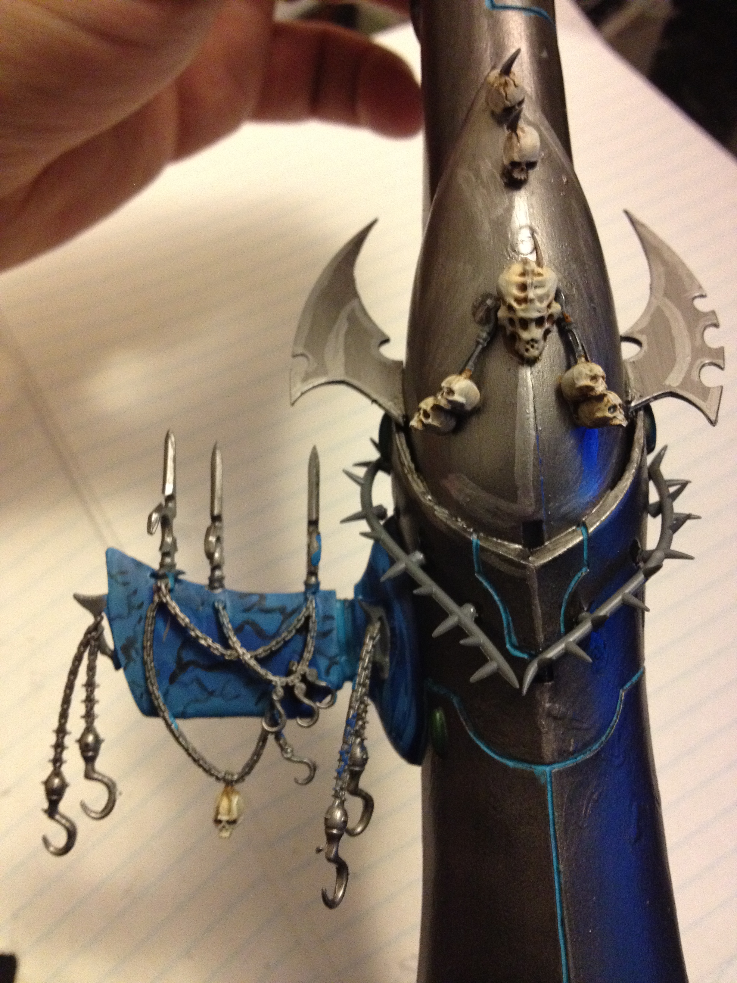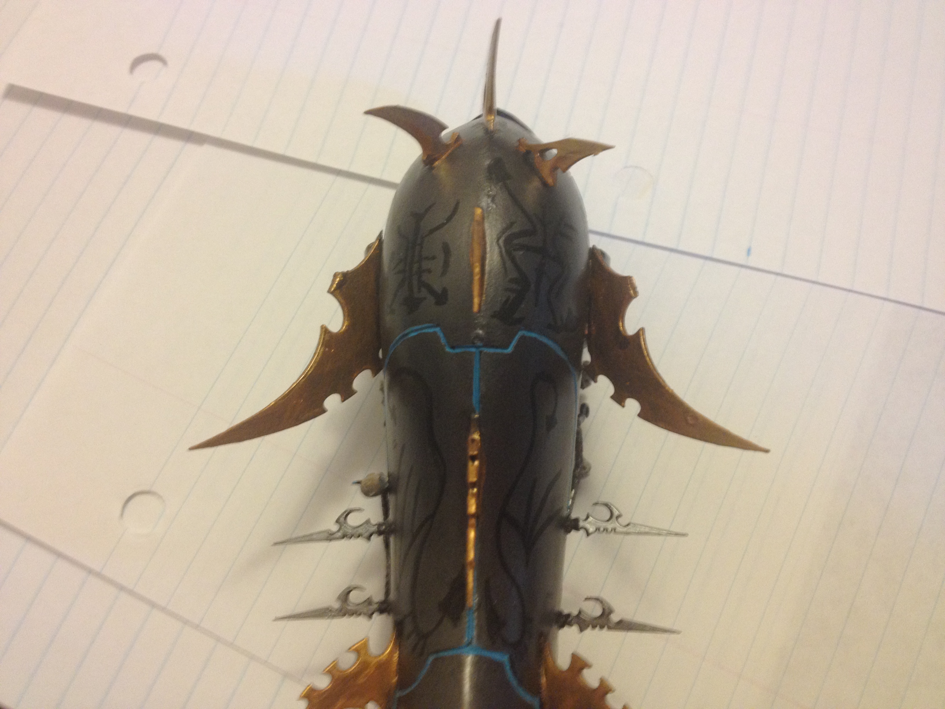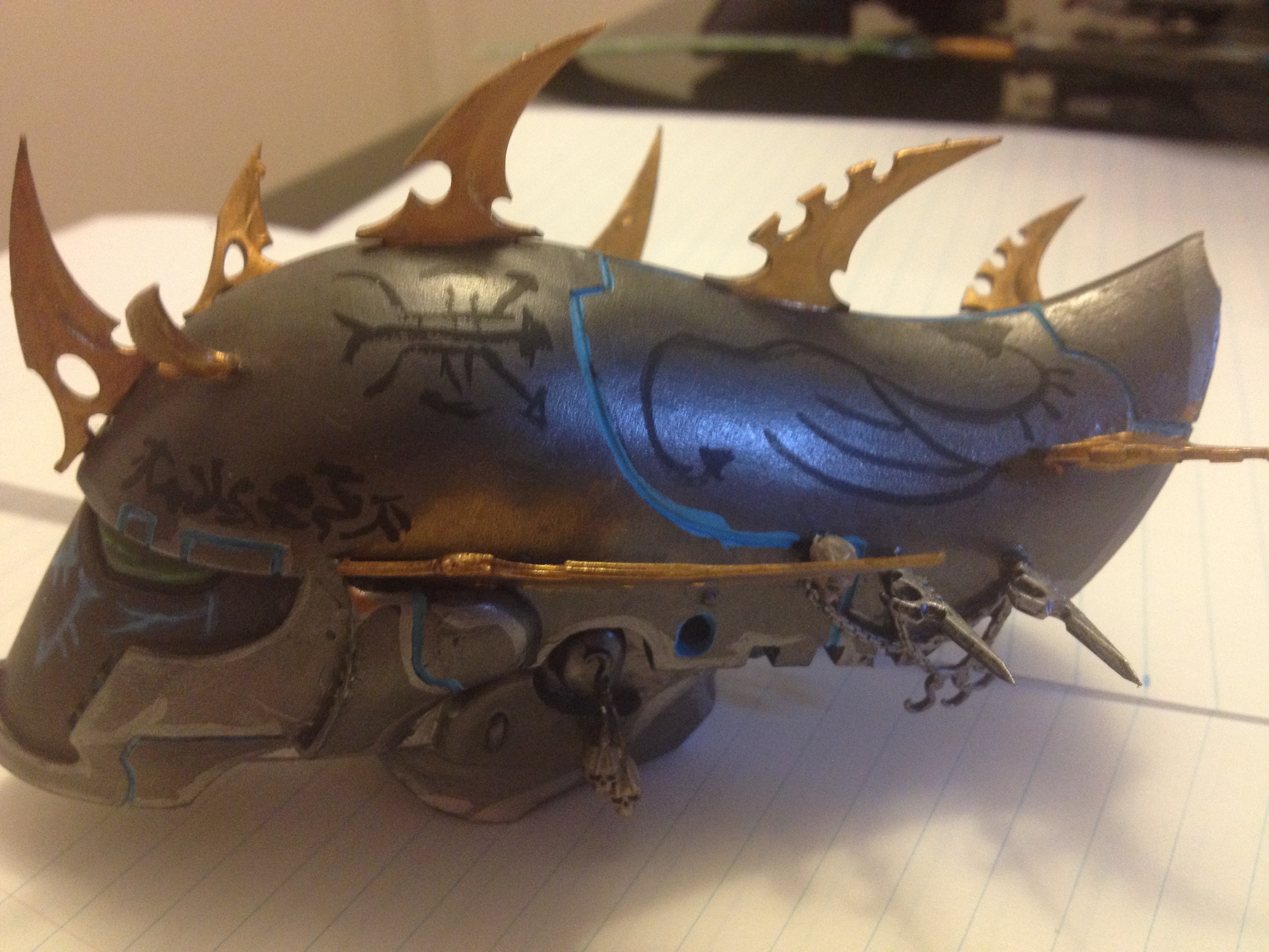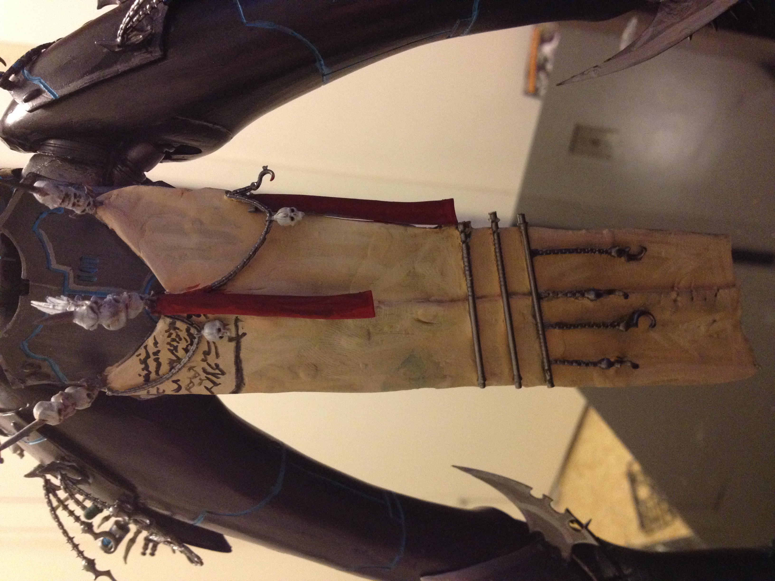 the loin cloth is made of greenstuff, and decorated up with whatever extra pieces of poles chains or other items from raider kits and so on. i plan on recording its battle history on the loin cloth, so its deleberatly left blank on most of it, save for its "inaugaration" script. the runes on the legs are imspired from the 1st DE codex, and i tried to go with a dragon motif in other areas.