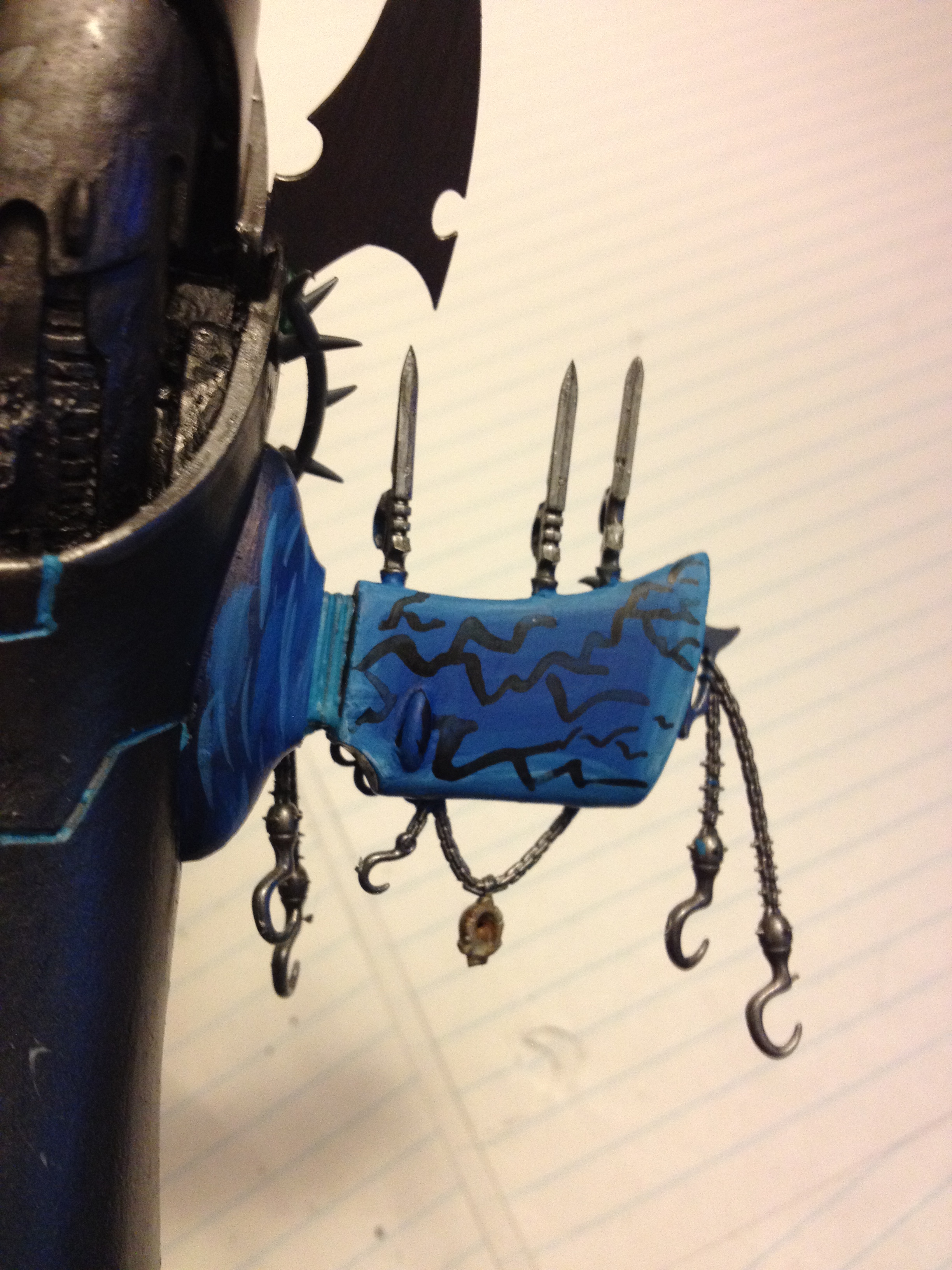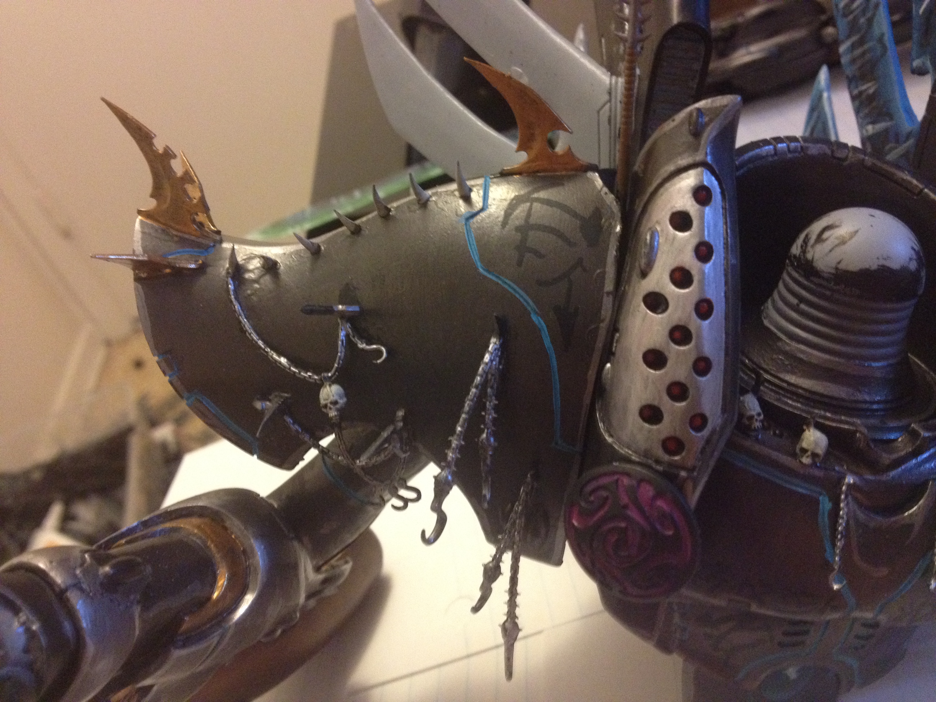 did some more work on the leg, focusing on the knee area. added a bunch of gubbins from the raider/venom kits. still some touch ups and final highlights to do, mainly with the vines but im probally just going paint and leave them black with some grey highlight. with the leg fin, i wanted to provide a source of the titans holo fields, so went with a blue theme with black lightning - to keep with the DE theme.