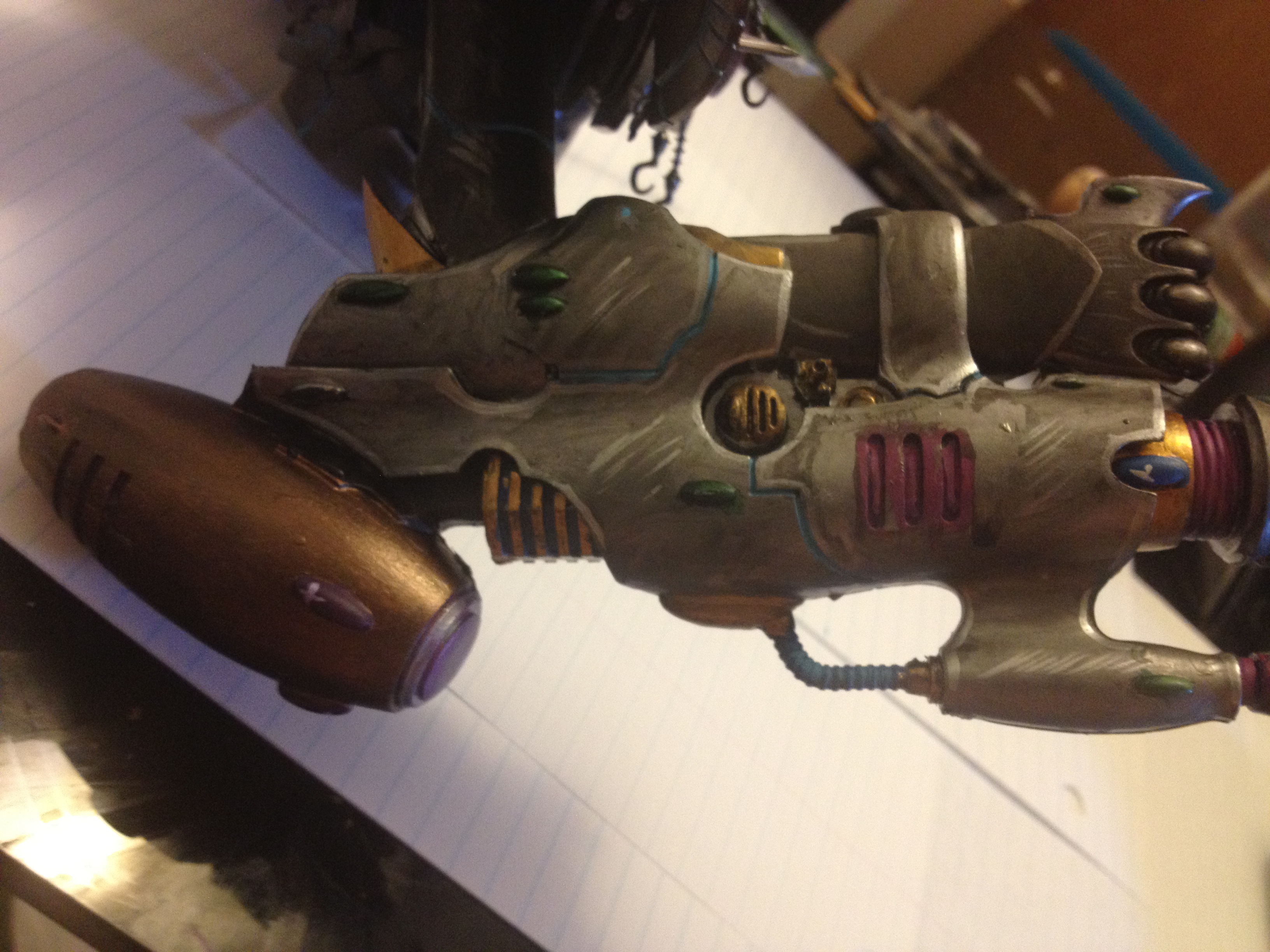 midterms in full swing, so less attention to blog then i would have liked. anyway some mor epainting progress done. ive managed to do most of all the CCW, torso and head. all that really remains is some detial and touch up work on the sword and torso, about half the back fins, then figuring out how to magnetize and pin some stuff to make swapping weapons and transport easier.