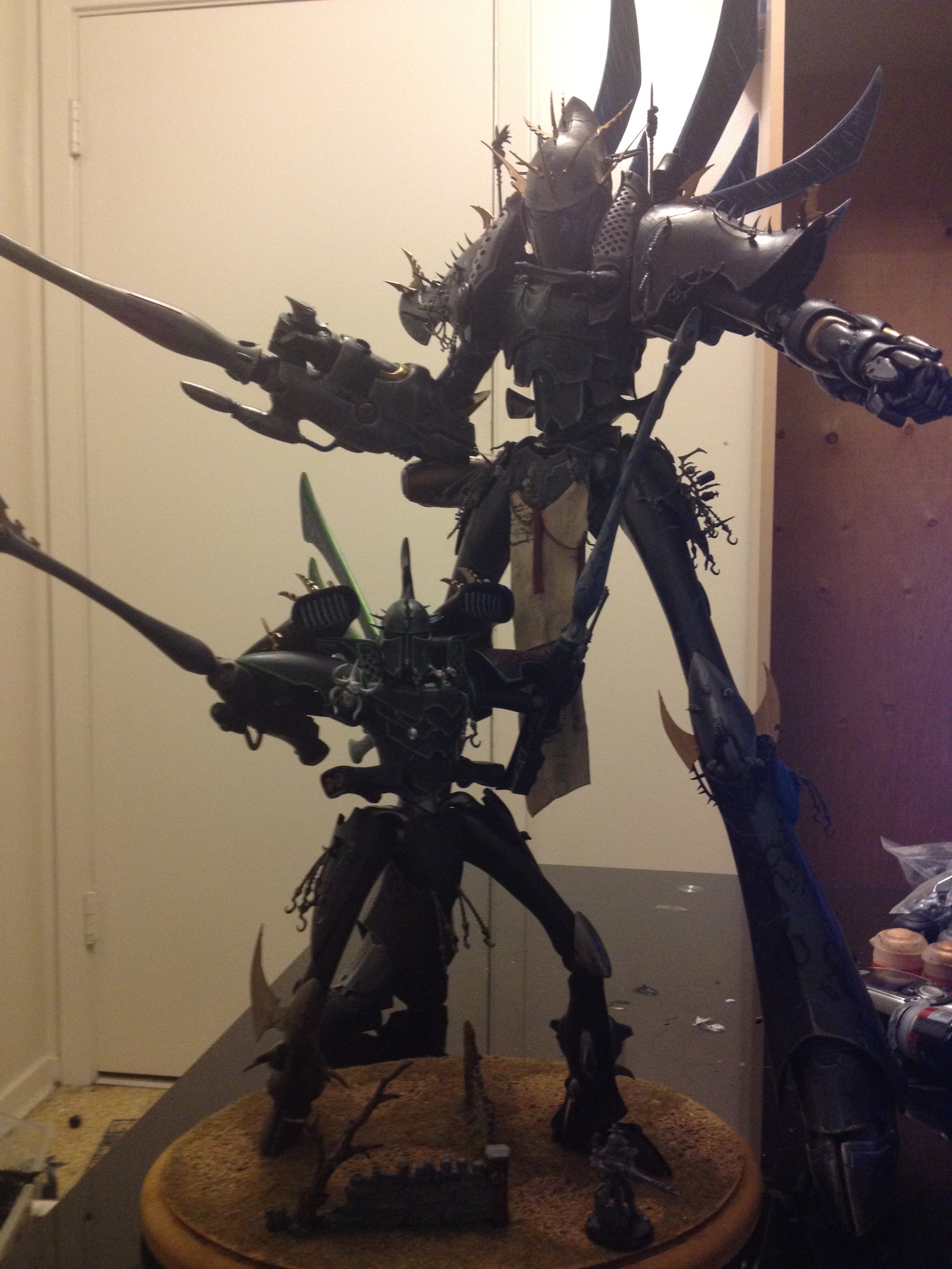 finished pic with my revenant beside it, and a standard warrior on the revenenant base. (the base also adds about 1" height)