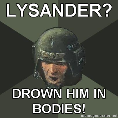 Brother SRM wrote:Lysander is a goddamn wrecking ball. I love him. He can be used effectively with a Sternguard squad; drop podding a squad of 10 in with Lysander into enemy territory and assassinating a key unit is a great tactic. Expensive, but cool. The only problem is on the counter attack they'll get mauled, but it can work if they're well supported.