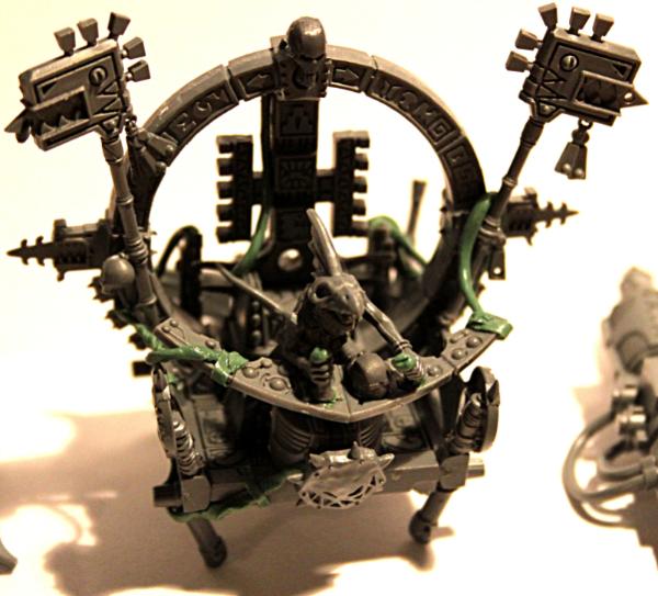 I wish I had a bit more to work with, even as a rough, poster- tac'd mockup. My biggest concern at the moment is whether the thing will feel sufficiently orky. Lizardmen aesthetics already seem to fall somewhat between Snakebite Orks and Necrons, so I worry that leaving lizards around and simply "teching up" the thing, at least in your current direction, might have somewhat muddy results (i.e. visually unclear, until explained by very specific fluff).