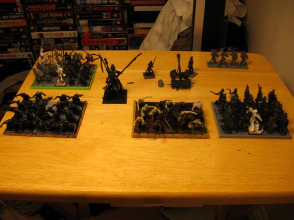 I bought Mantic's Mhorgoth's Revenge a while back, as well as a Soultaker detachment - for me Mantic's undead range has a good, old-school touch to them, with the Skeletons reminding me of "Army of Darkness". So I had 20 Skeletons with Spears, 20 Wights/Graveguard/Revenents/Armoured Skeleton Warriors, 18 Ghouls with a Ghast, 15 Zombies, a Screaming Skull Catapult and a Gamezone's "Leonara" Vampire - a great start! You can even see a portion of my beloved VHS collection in the background!